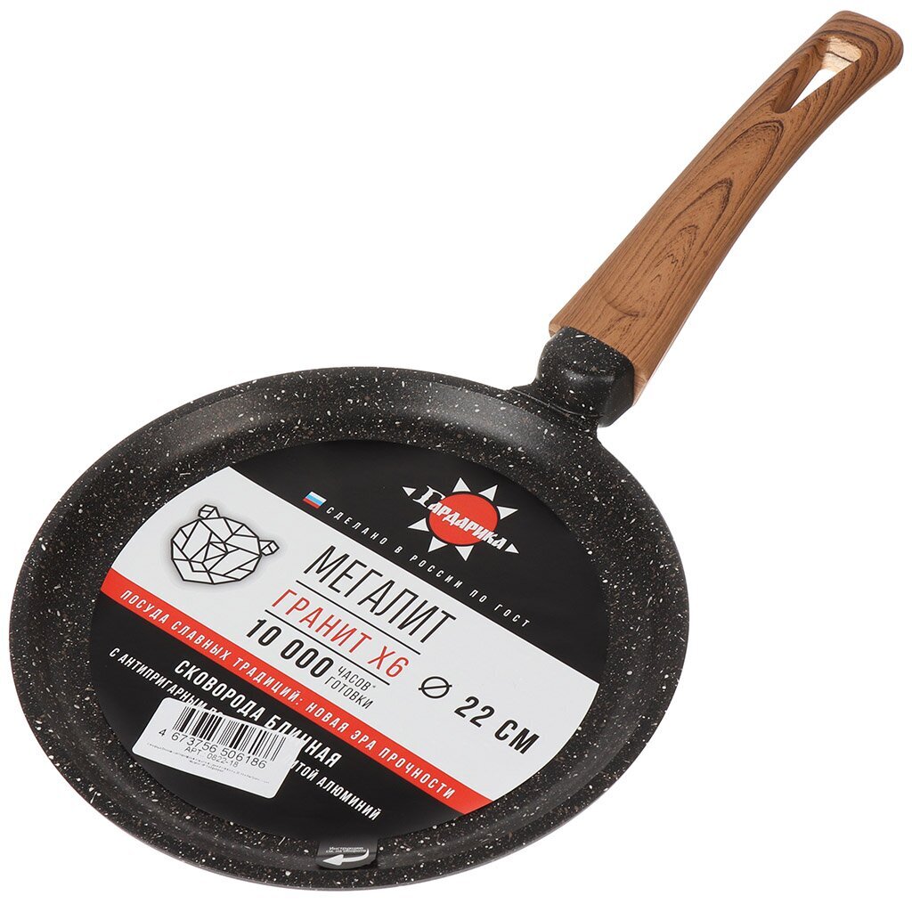 Вы можете приобрести «Блинница алюминий, 22 см, антипригарное покрытие, Гардарика, Мегалит 18, 0822-18, бакелитовая ручка, ручка soft-touch» и другие товары в нашем интернет-магазине в Шахтах по низким ценам и с бесплатным самовывозом.
