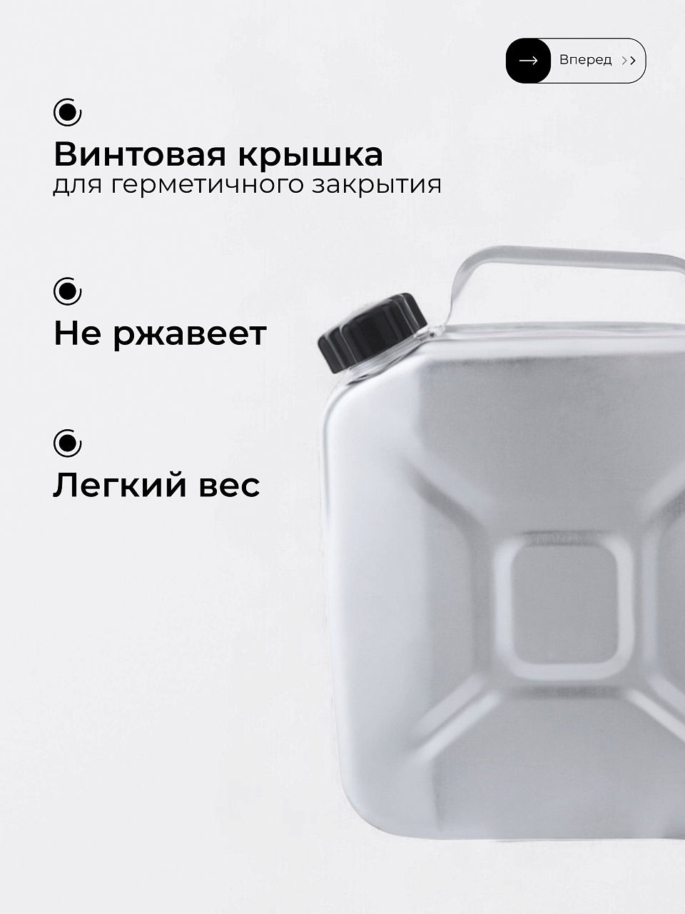Винтовая крышка идет в комплекте, горловина стандартного размера 4 см — подходит для большинства универсальных пробок и заливных устройств.