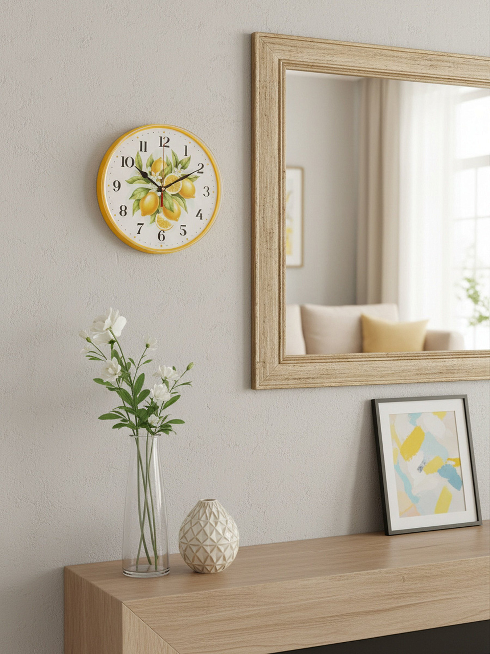 В отличие от аналогов с монотонным оформлением, эти часы сразу привлекают внимание и создают позитивную атмосферу. Как использовать настенные часы с лимонами? Просто повесьте их на стену — благодаря диаметру 25 см они отлично видны даже издалека. Подходят ли такие часы для дачи? Да, кварцевый механизм не требует сложного ухода, а яркий дизайн украсит любой интерьер.