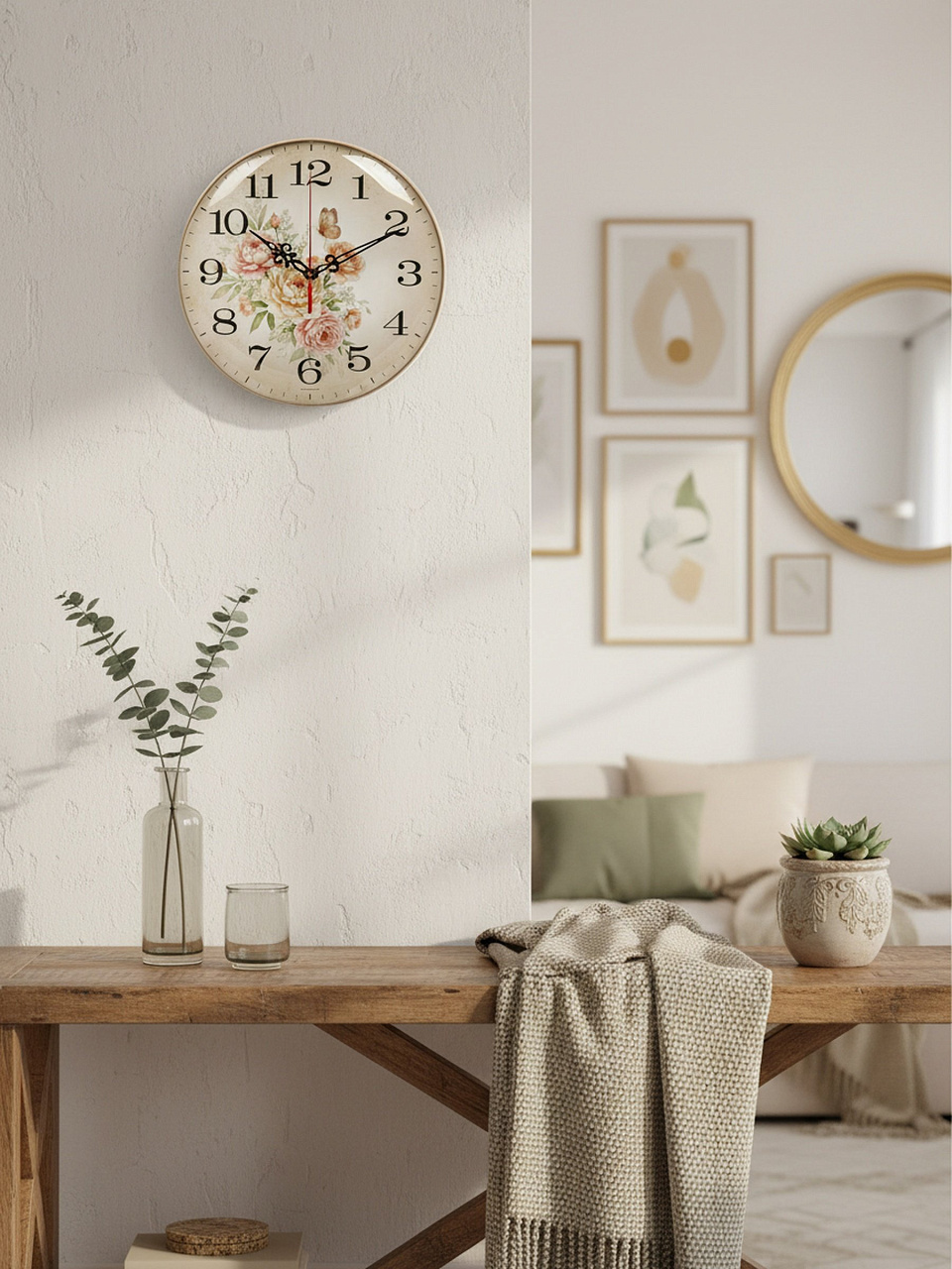 Настенные кварцевые часы d=25 см «Рубин» с бежевым основанием и цветочным узором — стильный акцент для дома, дачи или подарка. Точный ход, долговечный механизм, гармония в интерьере.