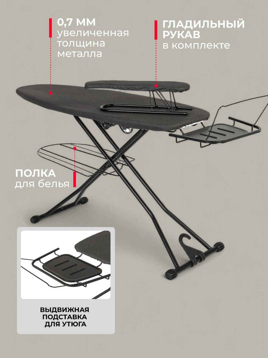Поролоновый чехол гарантирует бережное отношение к ткани и отличное скольжение утюга. Встроенный гладильный рукав облегчает уход за рубашками, блузками и детскими вещами, обеспечивая аккуратный результат без лишних усилий. Специальная полка для белья позволяет организовать рабочее пространство и держать под рукой всё необходимое. Удлинитель длиной 3 метра избавляет от необходимости использовать дополнительные провода и удлинители, делая процесс глажки более мобильным.