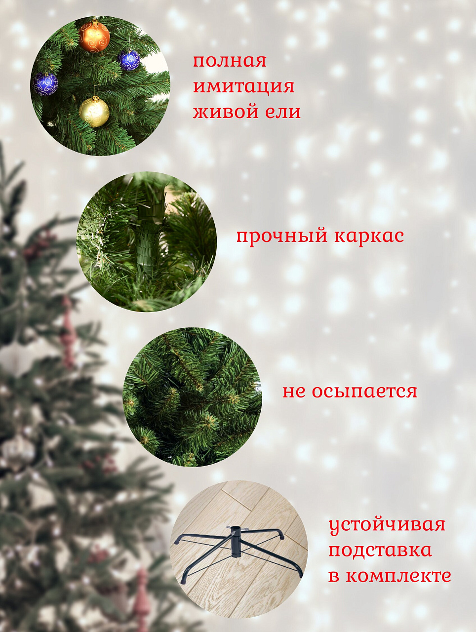 - Высота 180 см, диаметр 120 см, 658 веток — впечатляющая пышность и прочность конструкции