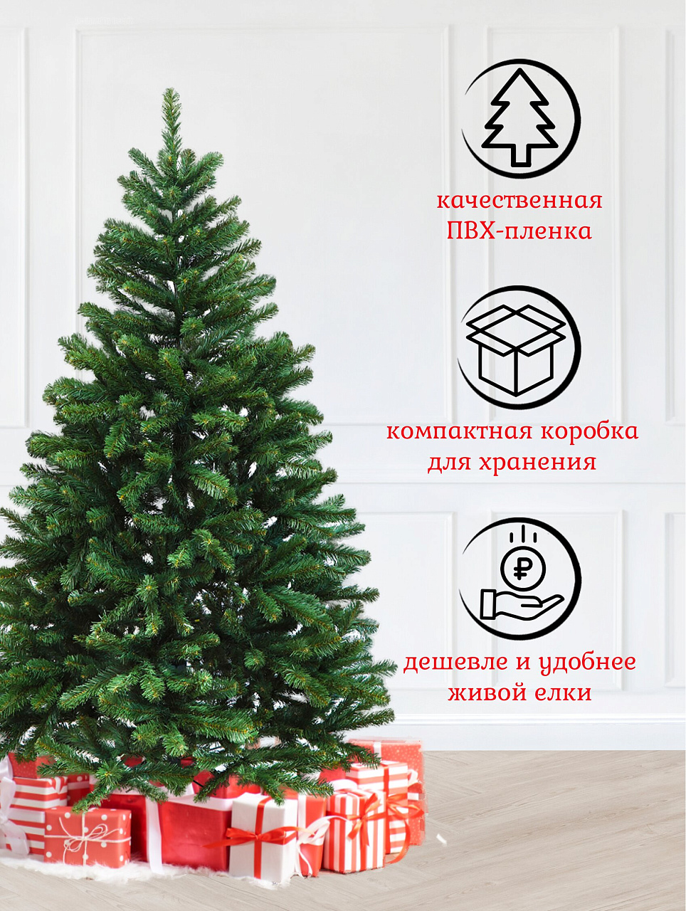 - Плотная хвоя из ПВХ-пленки — выглядит как настоящая, не осыпается, гипоаллергенна