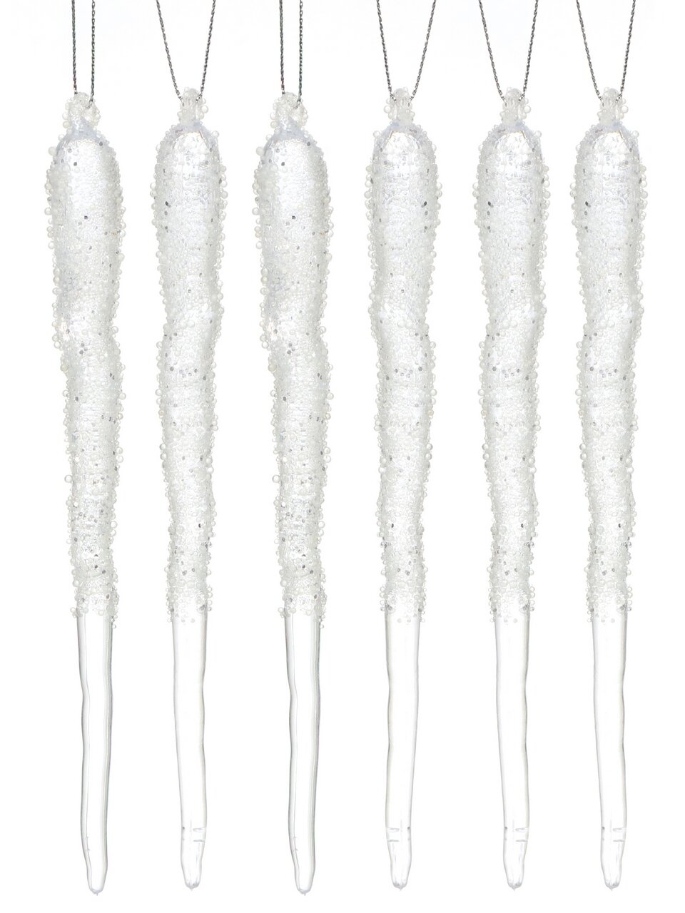 В наборе 5 прозрачных сосулек, каждая длиной 19 см, материал — пластик. Это оптимальный комплект для равномерного декорирования елки или создания композиции.