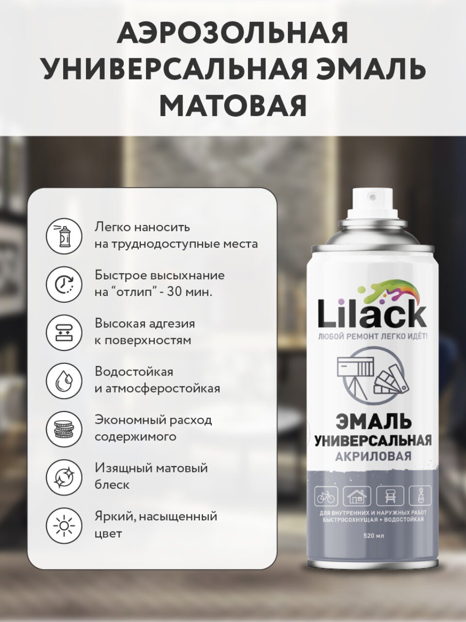 Эмаль аэрозоль Lilack 520 мл — быстрое и ровное матовое покрытие для любых поверхностей. Универсальное решение для ремонта, декора и защиты дома и дачи.