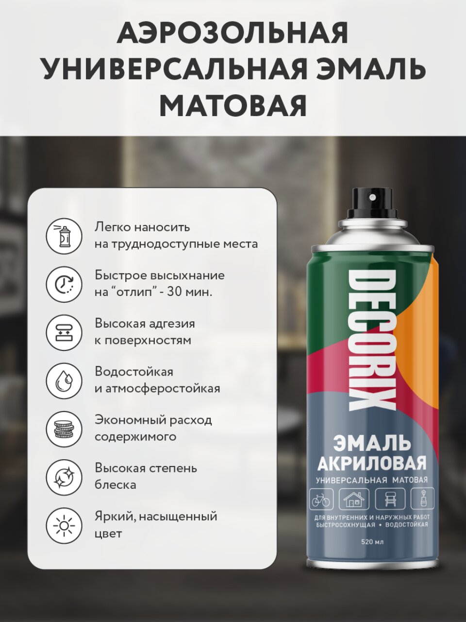 Высококачественная универсальная акриловая эмаль DECORIX используется в декоративно-оформительских работах, строительстве и ремонте.