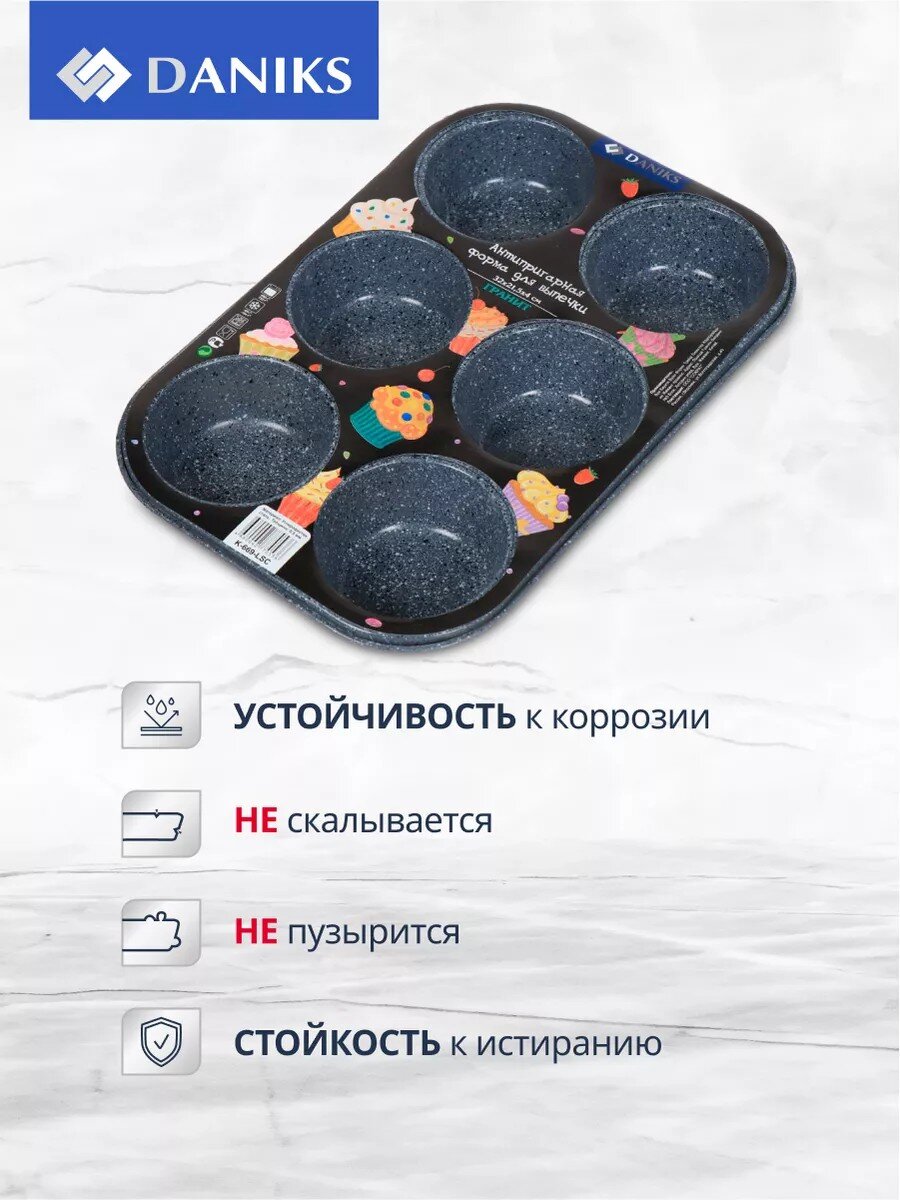 Форма для запекания Daniks Гранит 21.5х32 см: антипригарная сталь, 6 ячеек, идеальна для кексов и маффинов дома и на даче.