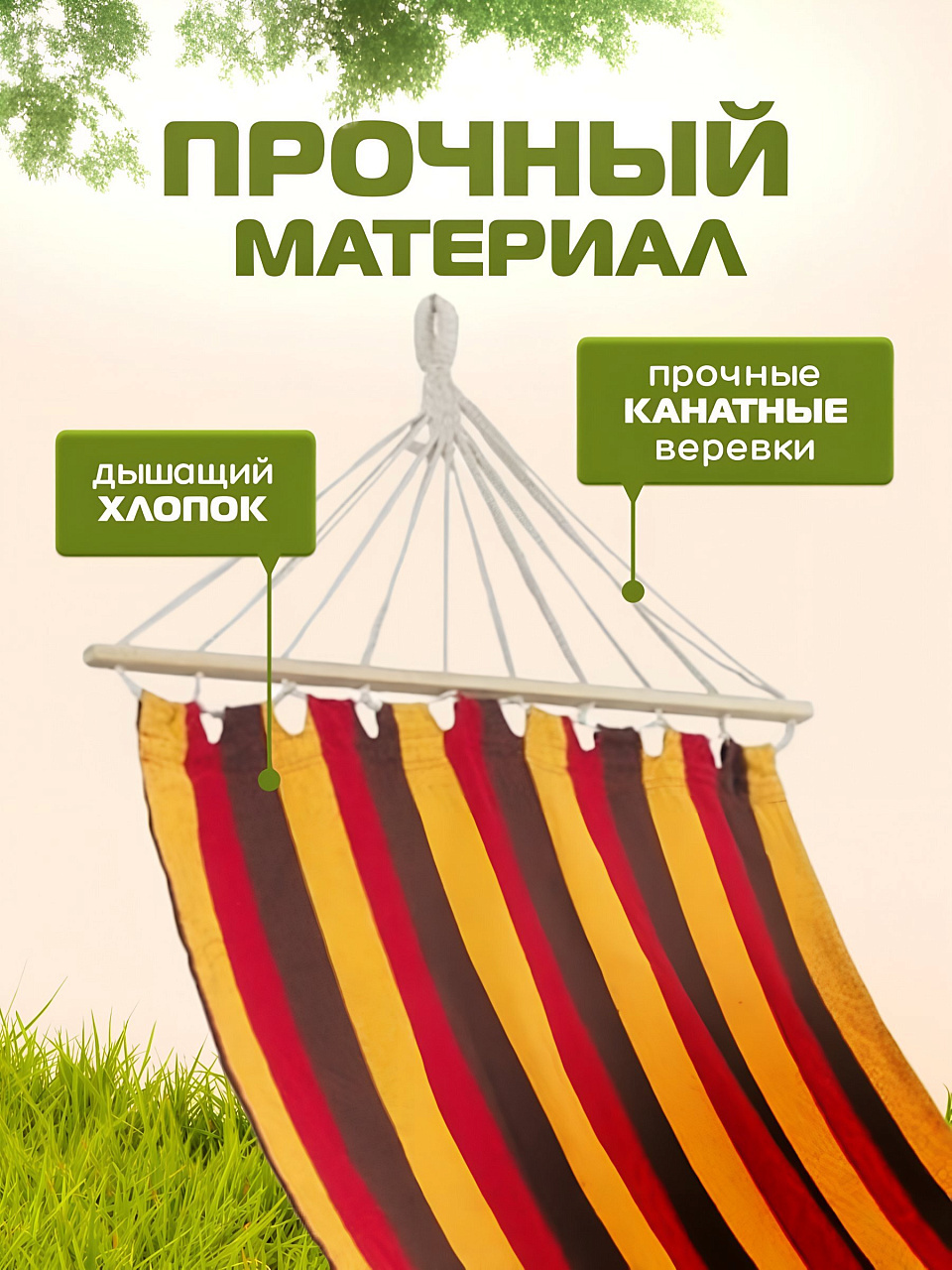 - Гамак изготовлен из прочного полотна, что гарантирует его долговечность и износостойкость. Хлопок приятен на ощупь и обеспечивает максимальный комфорт во время отдыха.