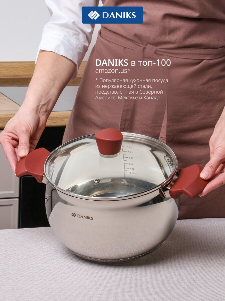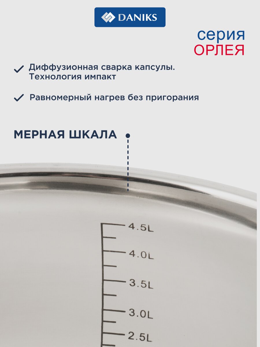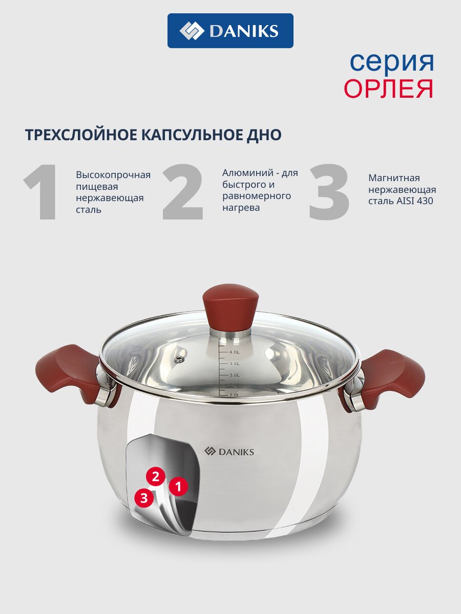 Кастрюля Daniks Орлея 5.1 л — практичный выбор для индукционных плит: нержавеющая сталь, стеклянная крышка с клапаном, мерная шкала, подходит для дома и дачи.