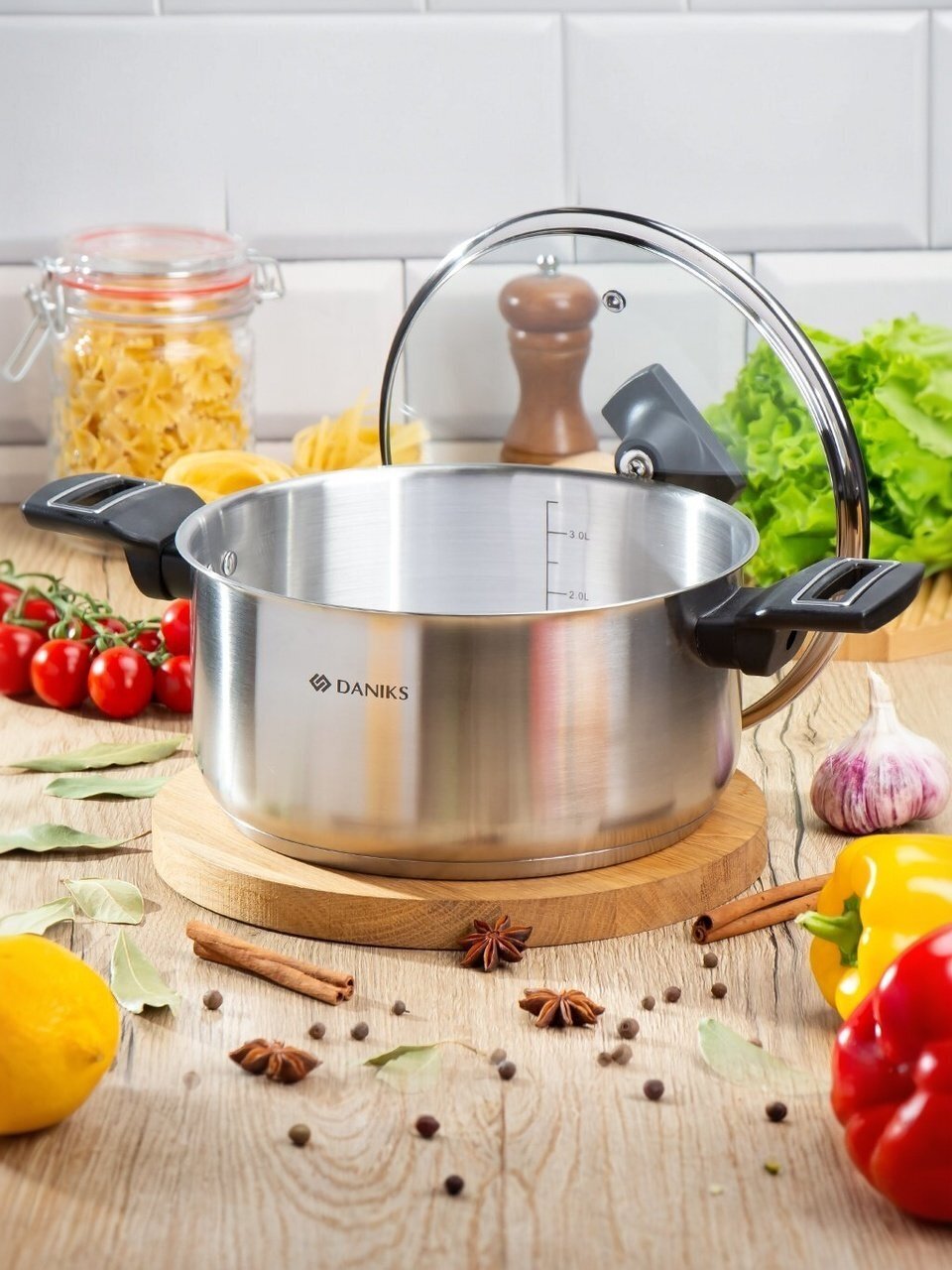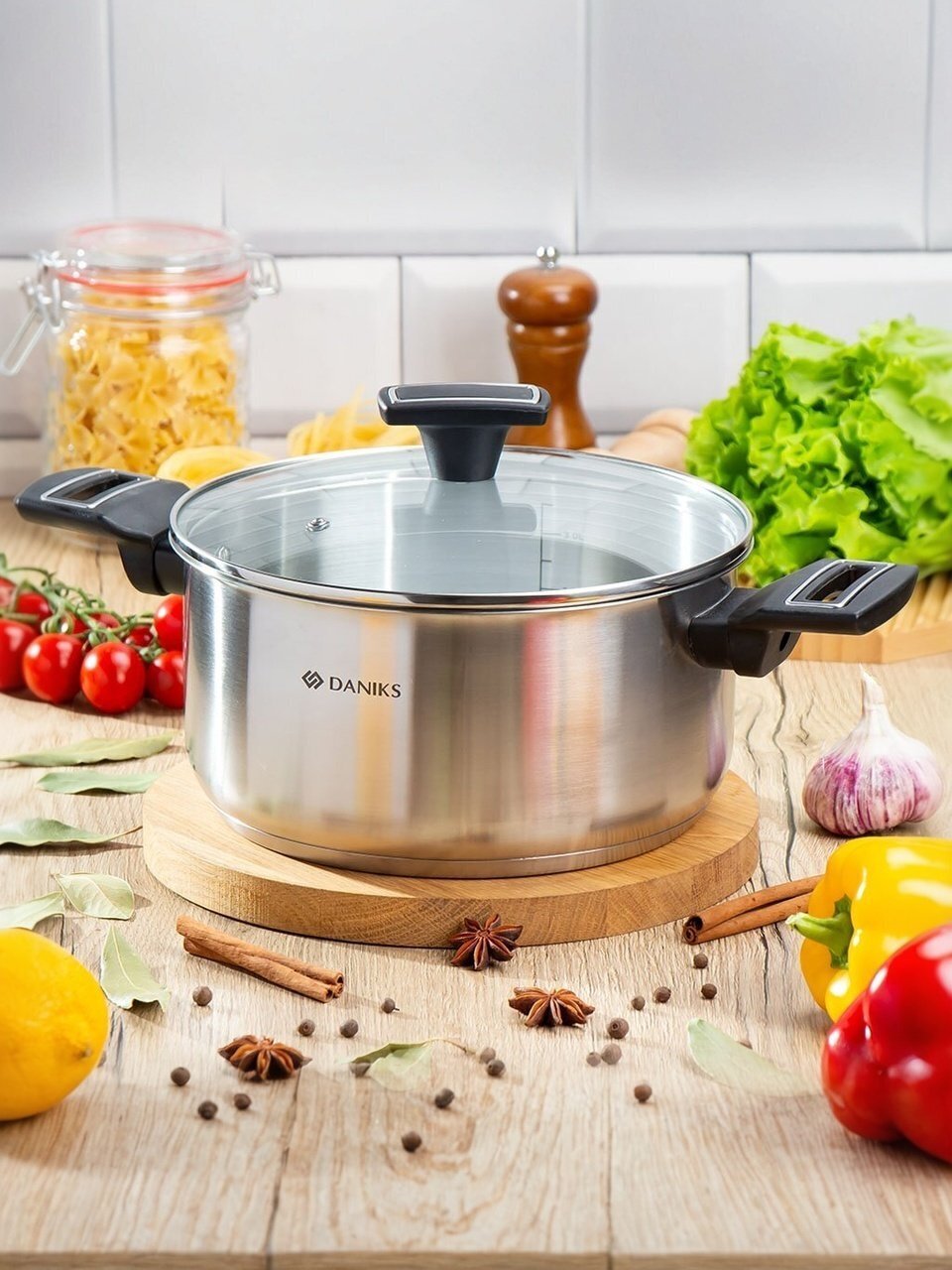 Кастрюля Daniks Айленд 4,1 л — это оптимальный выбор для тех, кто ищет долговечную посуду для ежедневного использования и современных кухонных задач. Корпус из нержавеющей стали 201 марки устойчив к коррозии, не впитывает запахи и легко отмывается, в том числе в посудомоечной машине. Капсульное дно толщиной 3 мм обеспечивает быстрый и равномерный нагрев, что важно для приготовления супов, каш и гарниров.