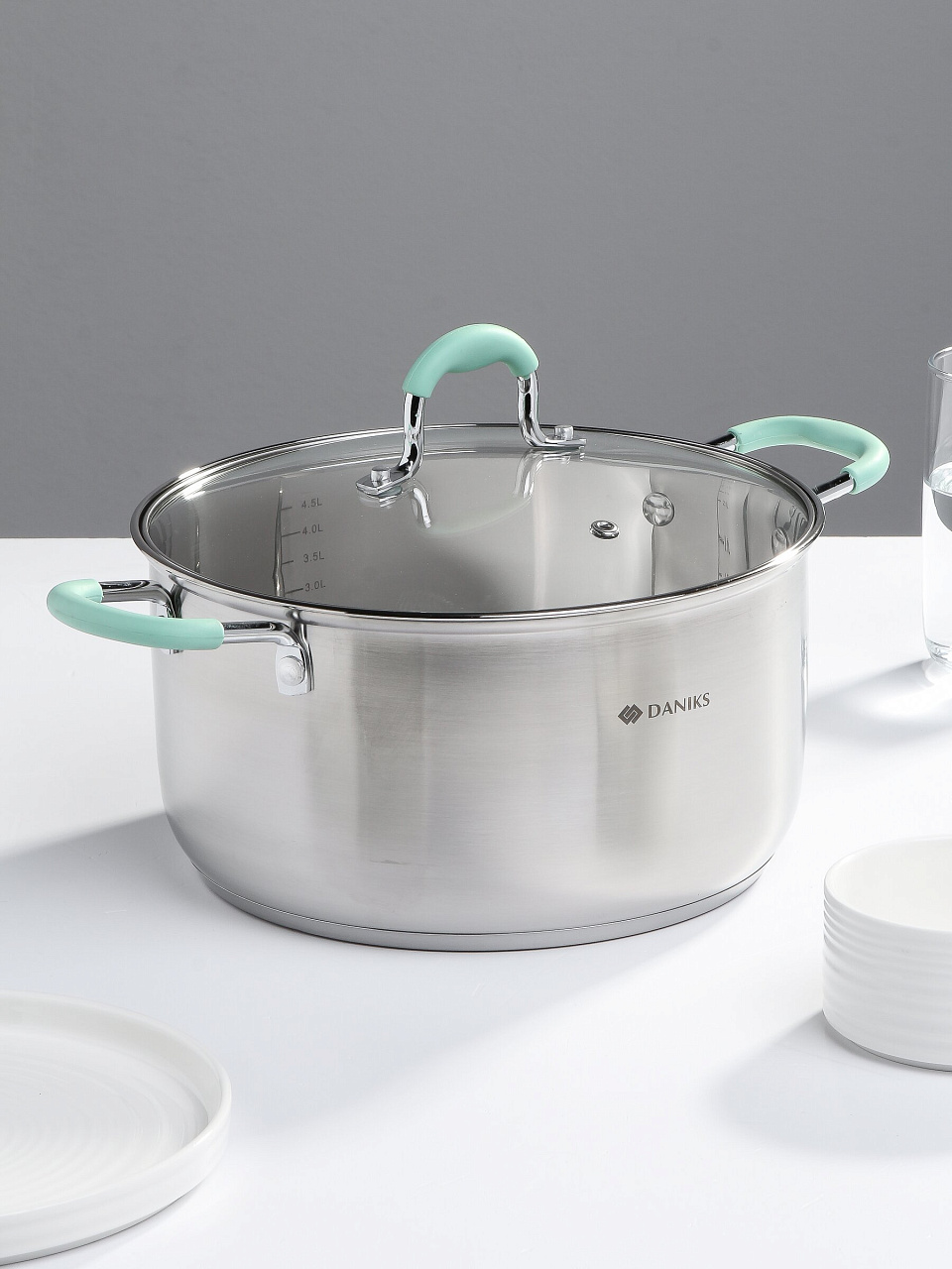 Вы можете приобрести «Кастрюля нержавеющая сталь, 5.8 л, крышка стекло, силиконовые ручки мятные, Daniks, Гринери, SD-23-24-2, индукция» и другие товары в нашем интернет-магазине в Липецке по низким ценам и с бесплатным самовывозом.