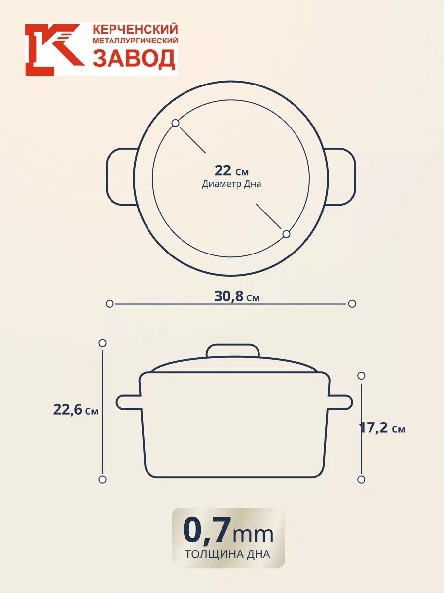 Диаметр кастрюли, дна и крышки — 22 см; высота без крышки — 17,2 см, с крышкой — 22,6 см, вес — 1,55 кг.