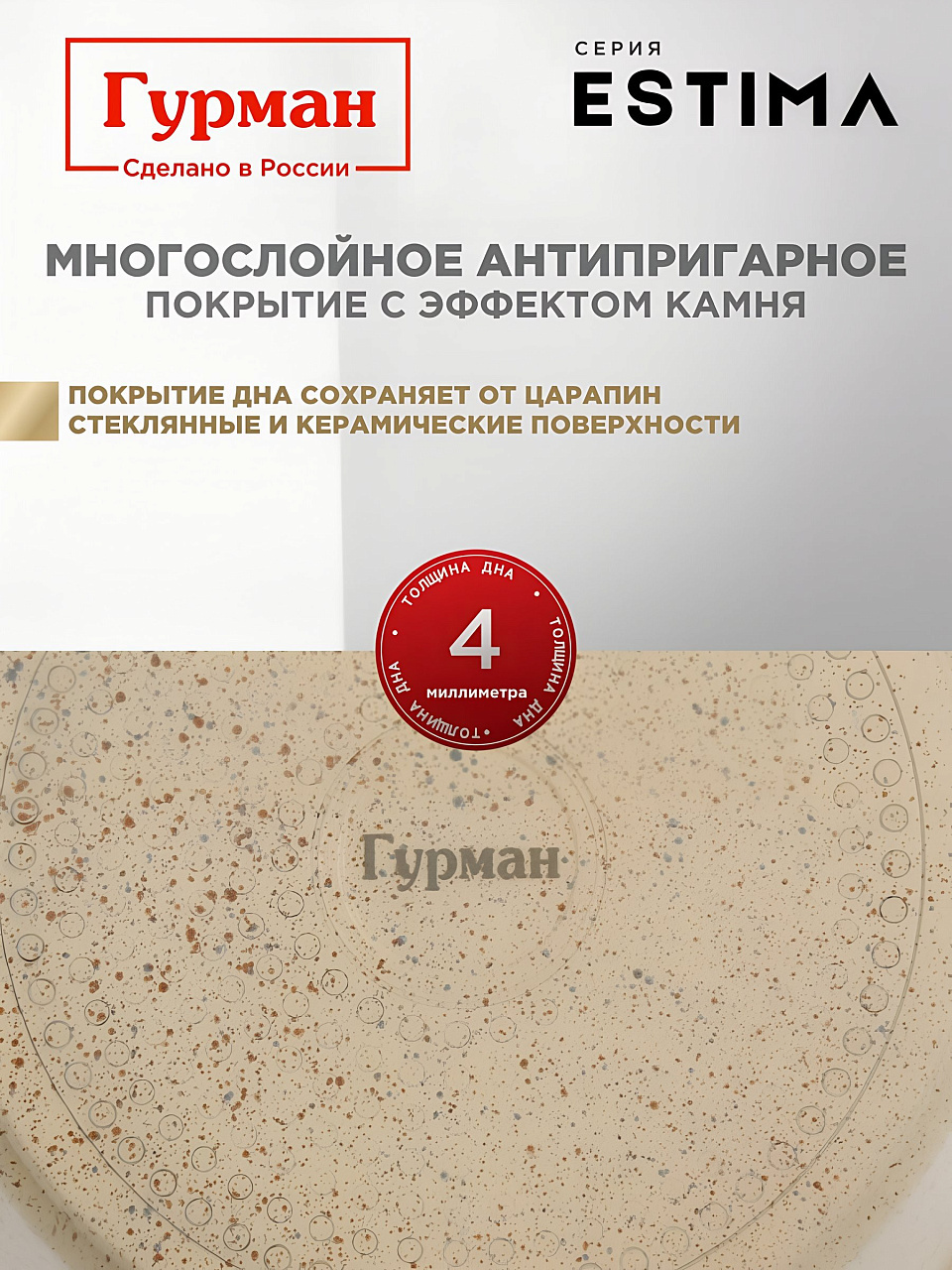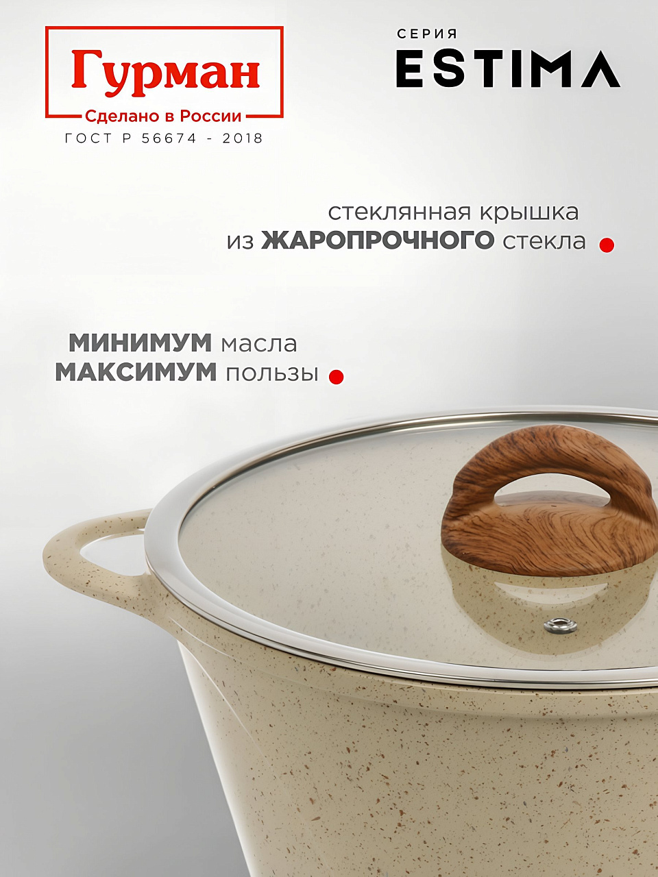 Выбирая кастрюлю Гурман Estima, вы получаете универсальный кухонный инструмент, который отлично подойдет как для дома, так и для дачи или в качестве подарка. Закажите прямо сейчас — получите выгодные условия и гарантированное качество от российского бренда.