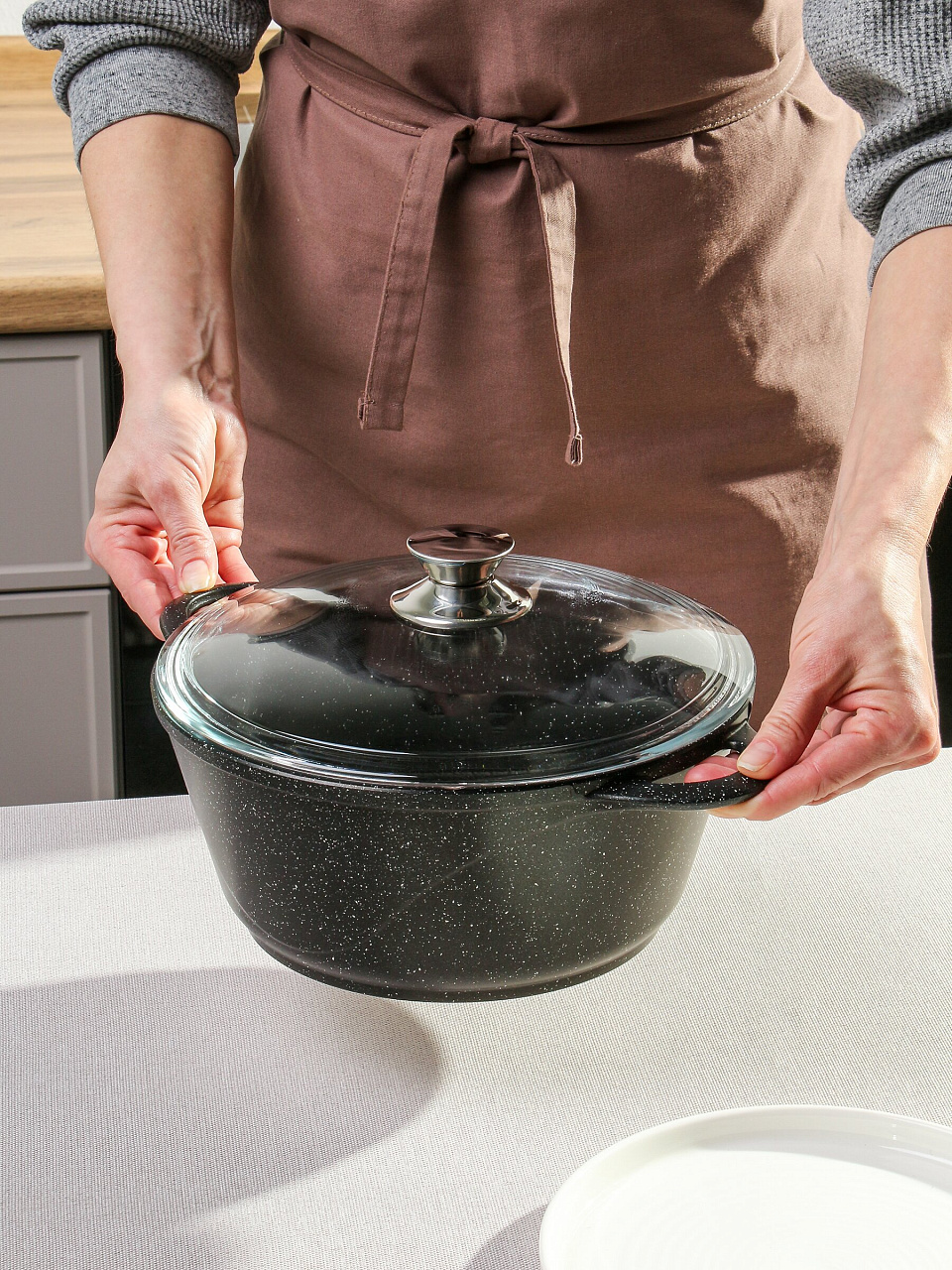 В отличие от обычных алюминиевых кастрюль без покрытия, эта модель не вступает в реакцию с продуктами и не окрашивается, а уход за ней занимает минуты — можно мыть в посудомоечной машине. Если вы ищете, какая кастрюля лучше для индукционной плиты — обратите внимание, что эта модель не подходит для индукции, зато отлично работает на газовых, электрических и стеклокерамических плитах, а также в духовке. Благодаря современному дизайну и прочности кастрюля Горница Гранит подойдёт как для ежедневного использования, так и в качестве подарка.