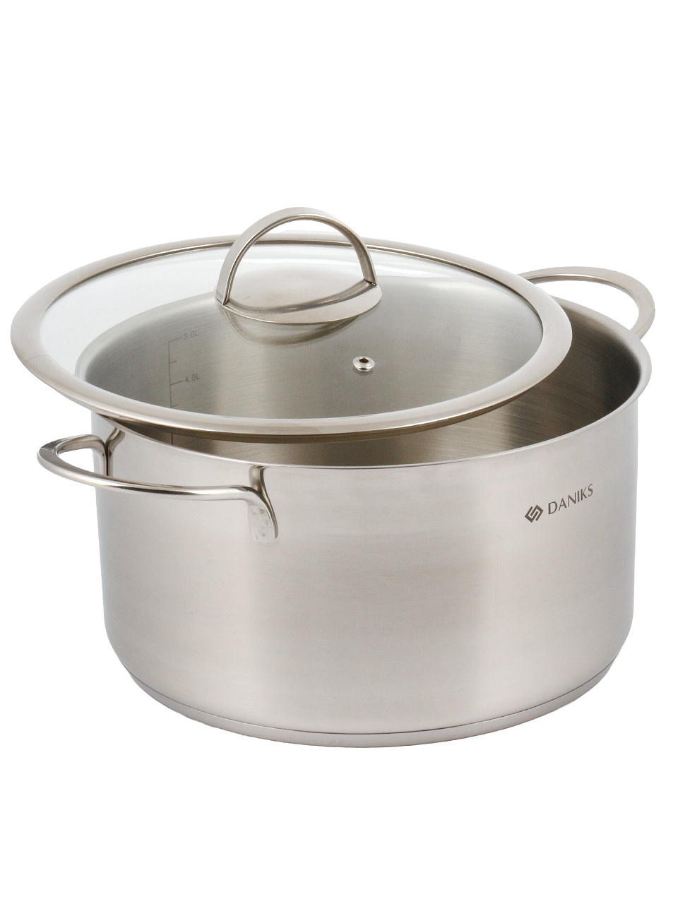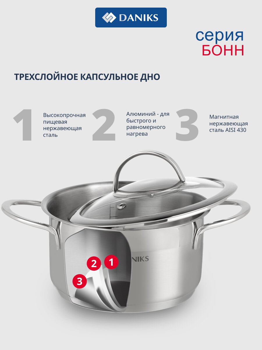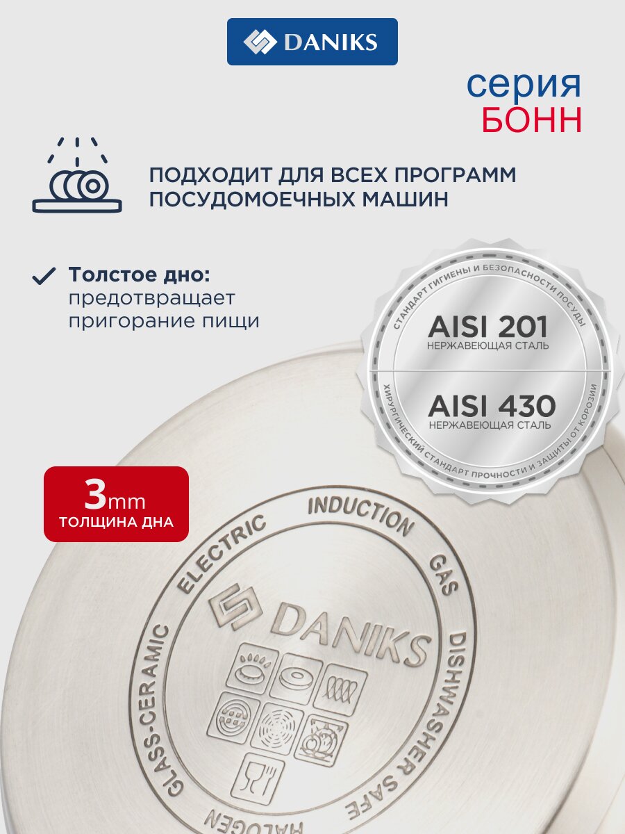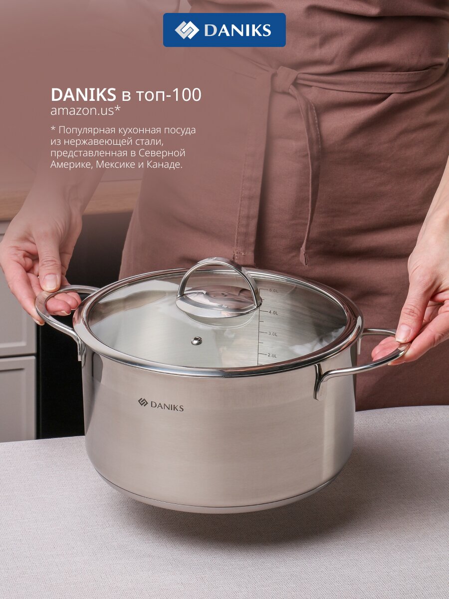 Кастрюля Daniks Бонн 5.8 л из нержавеющей стали с капсульным дном — оптимальный выбор для семьи: подходит для индукции, посудомоечной машины и любых блюд.