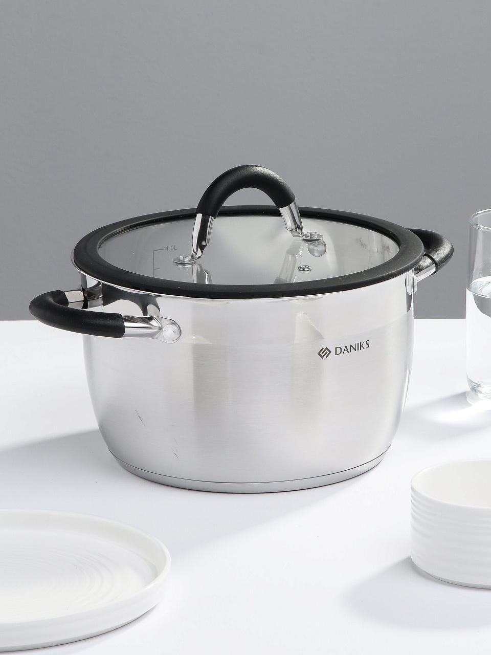 Если вы ищете, какую кастрюлю выбрать для индукционной плиты или универсальную посуду для разных типов плит, обратите внимание на Daniks Орландо. Модель выполнена из нержавеющей стали марки AISI 201, что обеспечивает долгий срок службы и устойчивость к коррозии. Капсульное дно толщиной 2.5 мм позволяет быстро и равномерно прогревать пищу, что выгодно отличает эту кастрюлю от аналогов с тонким дном.