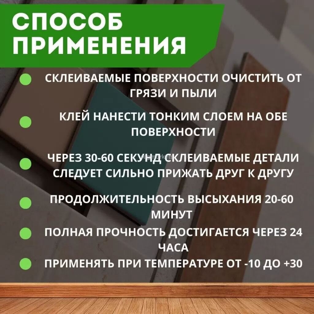 Склеиваемые поверхности очистить от пыли и загрязнений. Клeй нанести тонким слоем на обе склеиваемые поверхности кисточкой, валиком или тампоном, через 30-60 секунд склеиваемые детали следует сильно прижать друг к другу. Полная прочность достигается спустя 24 часа. Применять при температуре от -10°С до +30°С.