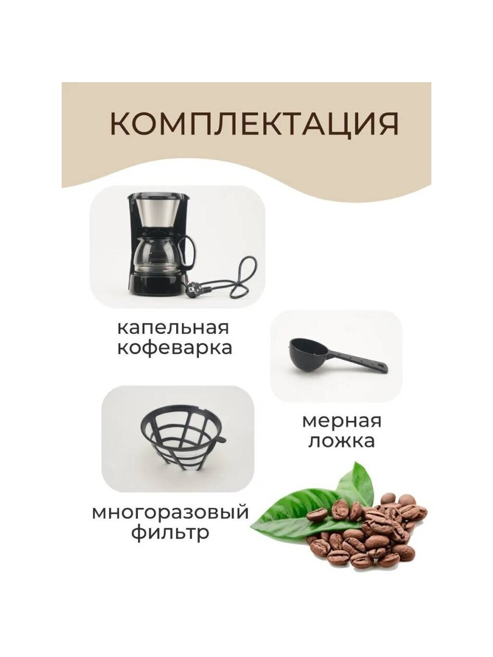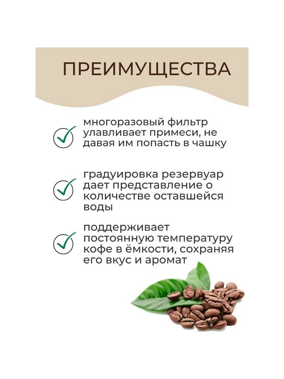 К кофеварке прилагается мерная ложка для кофе, с помощью которой можно легко и быстро отмерить необходимое количество молотого кофе. Благодаря градуировке резервуара владелец будет иметь представление о том, сколько воды осталось и сколько чашек ещё можно наполнить. Кофемашина имеет противокапельную систему, благодаря чему жидкость не попадает на столик с подогревом.