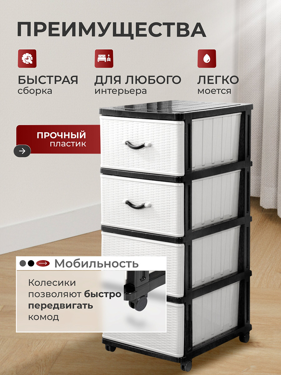Четырехсекционный комод Dunya практичен и вместителен. Имеет съемные колесики, обеспечивающие легкость передвижения. Комод изготовлен из прочного, экологически чистого пластика. Он легко моется и просто очищается.
