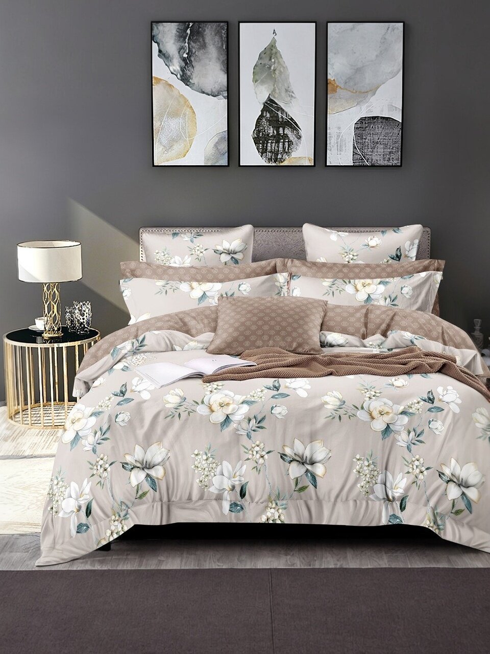 Постельное белье евро Silvano из поплина: 6 предметов для комфортного сна, 100% хлопок, стильный цветочный дизайн, подарочная упаковка.