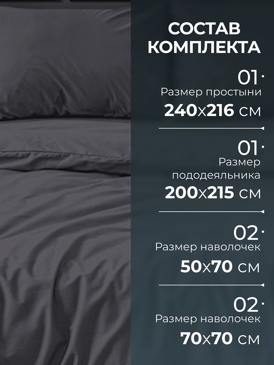 В наборе простыня 216х240 см и пододеяльник 200х215 см — оптимально для евро-кроватей стандартных и увеличенных размеров.