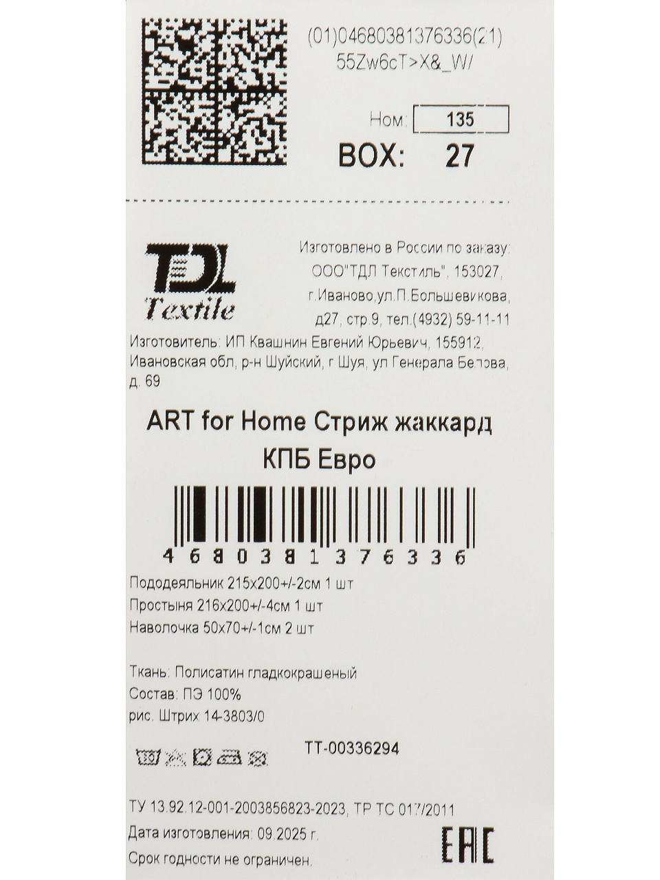- Евро-размер: пододеяльник 200х215 см, простыня 200х216 см, 2 наволочки 50х70 см – подходит для большинства современных кроватей.