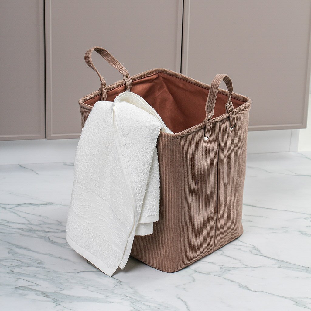 Часто спрашивают: как выбрать корзину для хранения? Эта модель выделяется вместимостью и прочностью: в отличие от пластиковых или плетёных аналогов, вельвет не царапает пол и не ломается при нагрузке. Ручки обеспечивают комфортную переноску даже при полной загрузке. Нет крышки — удобно для быстрого доступа к содержимому. Универсальное назначение: можно использовать для детских вещей, аксессуаров, хранения сезонной одежды или как декоративный элемент. Подходит ли для подарка? — Да, лаконичный дизайн и премиальный материал делают корзину отличным вариантом для презента.