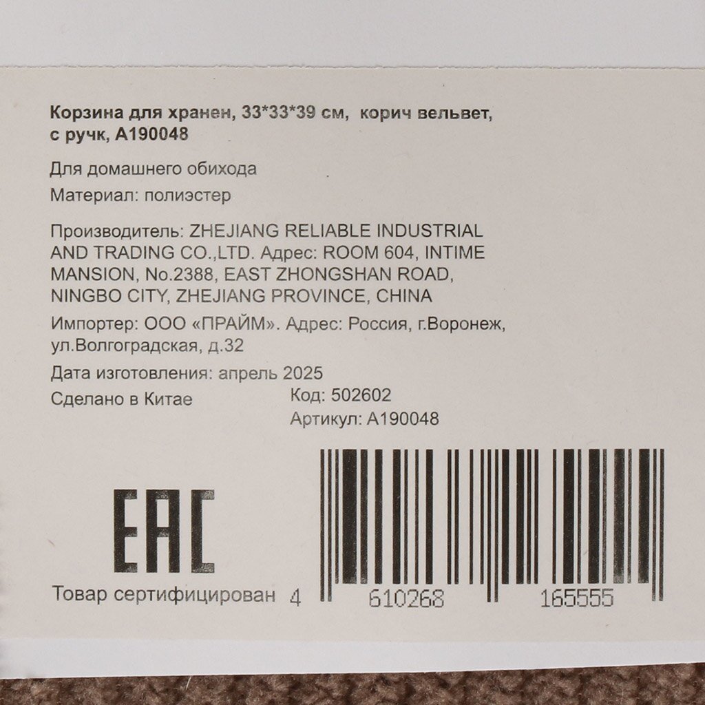 Корзина для хранения 33×33×39 см из коричневого вельвета с ручками — стильное решение для порядка дома, дачи или подарка. Вместимость, премиальный материал, легко переносить.