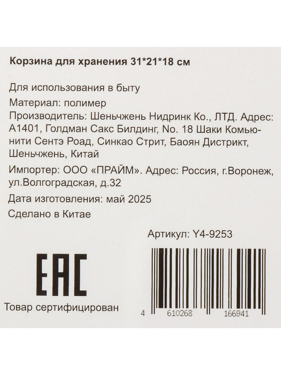Корзина имеет размеры 31 см в ширину, 21 см в глубину и 18 см в высоту, что делает её удобной для хранения как мелких, так и средних вещей.
