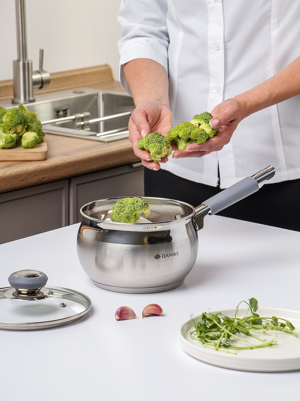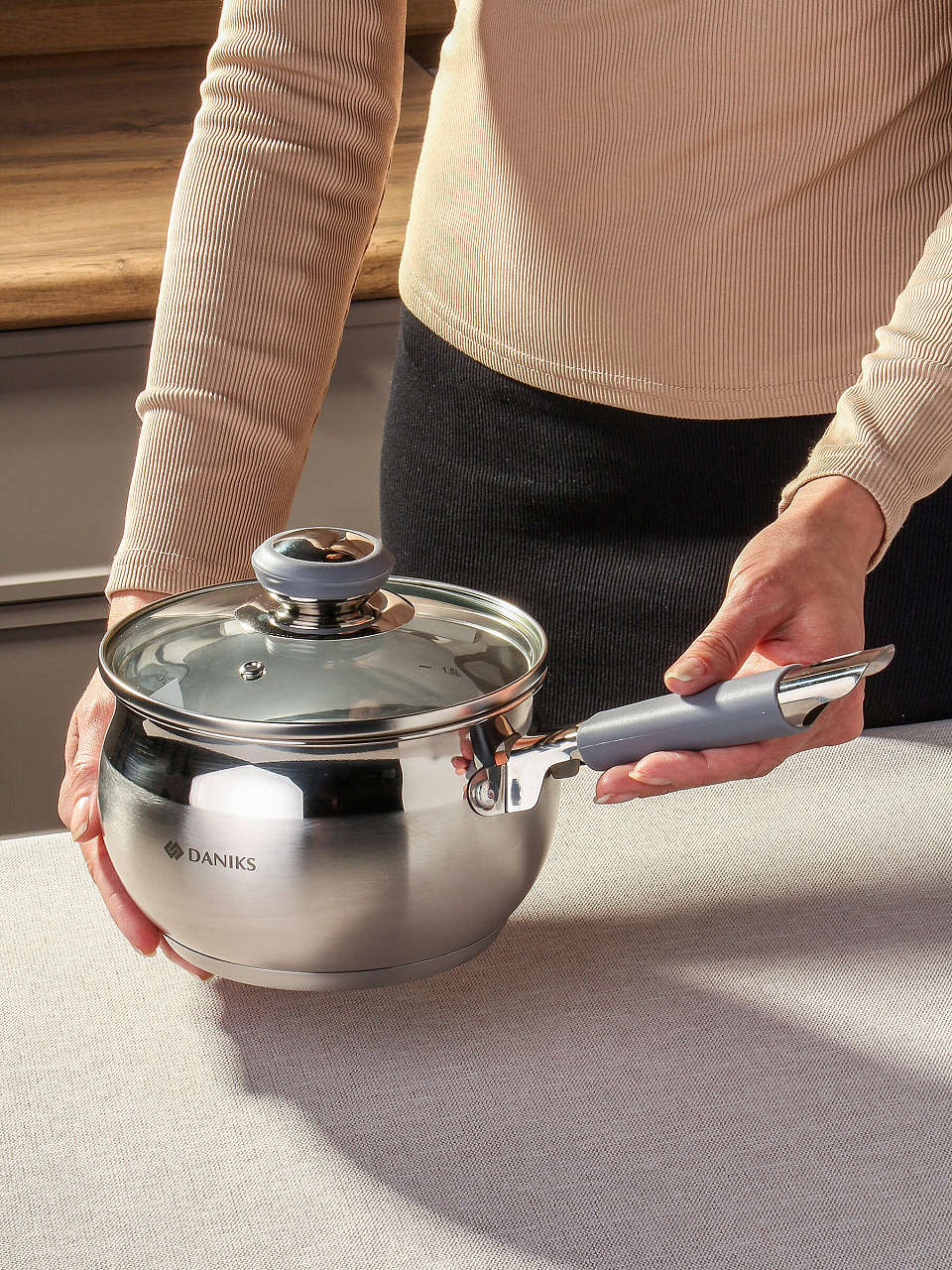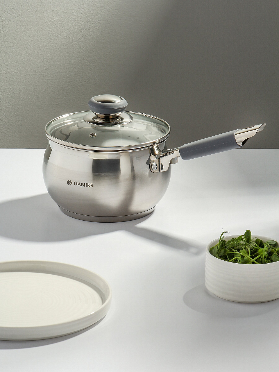 Ковш Daniks Модерн 2 л: нержавеющая сталь, стеклянная крышка и силиконовая ручка — идеальный выбор для индукционных плит и ежедневного использования.