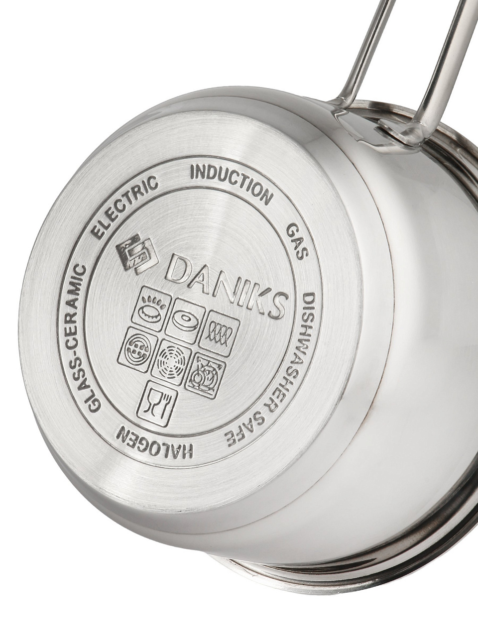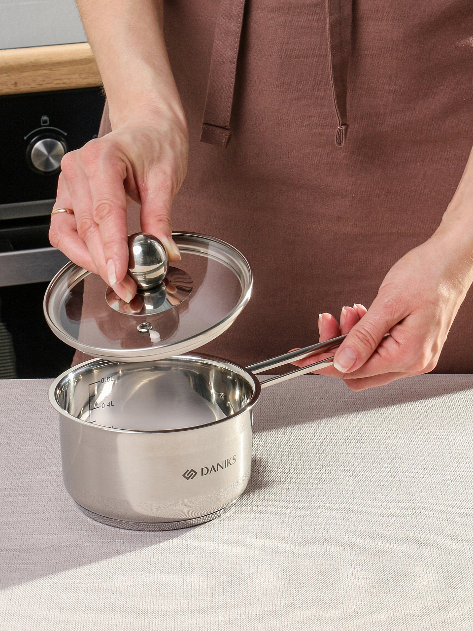 Ковш Daniks 0.8 л из нержавеющей стали с крышкой: компактное решение для быстрой готовки и разогрева на любой плите, включая индукцию.