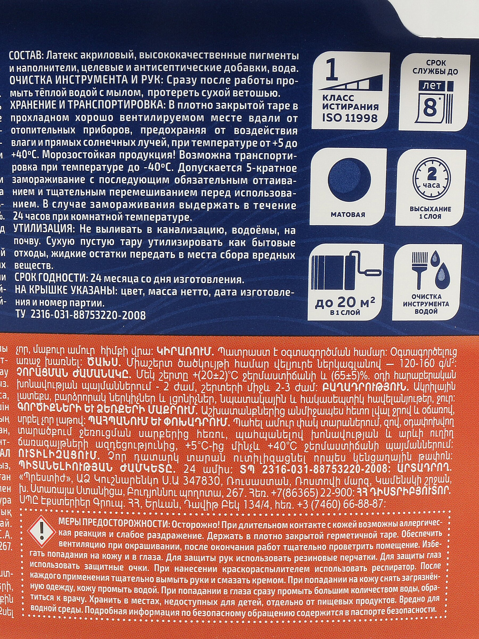 Объём — 2,4 кг, цвет — терракотовый (коралловый для сайта), матовая поверхность, акриловая основа, срок годности — 24 месяца.