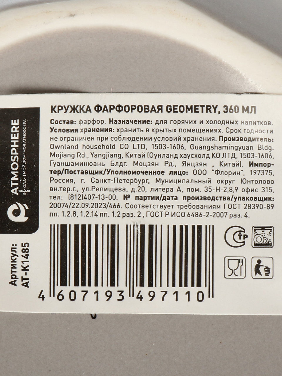 Да, фарфоровая кружка Atmosphere Geometry полностью подходит для мытья в посудомоечной машине — материал устойчив к температуре и бытовой химии.