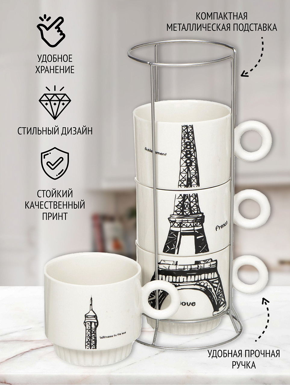 Вы можете приобрести «Кружка керамика, 4 шт, 220 мл, Эйфелева башня, JC-11782, металлическая подставка» и другие товары в нашем интернет-магазине в Ельце по низким ценам и с бесплатным самовывозом.