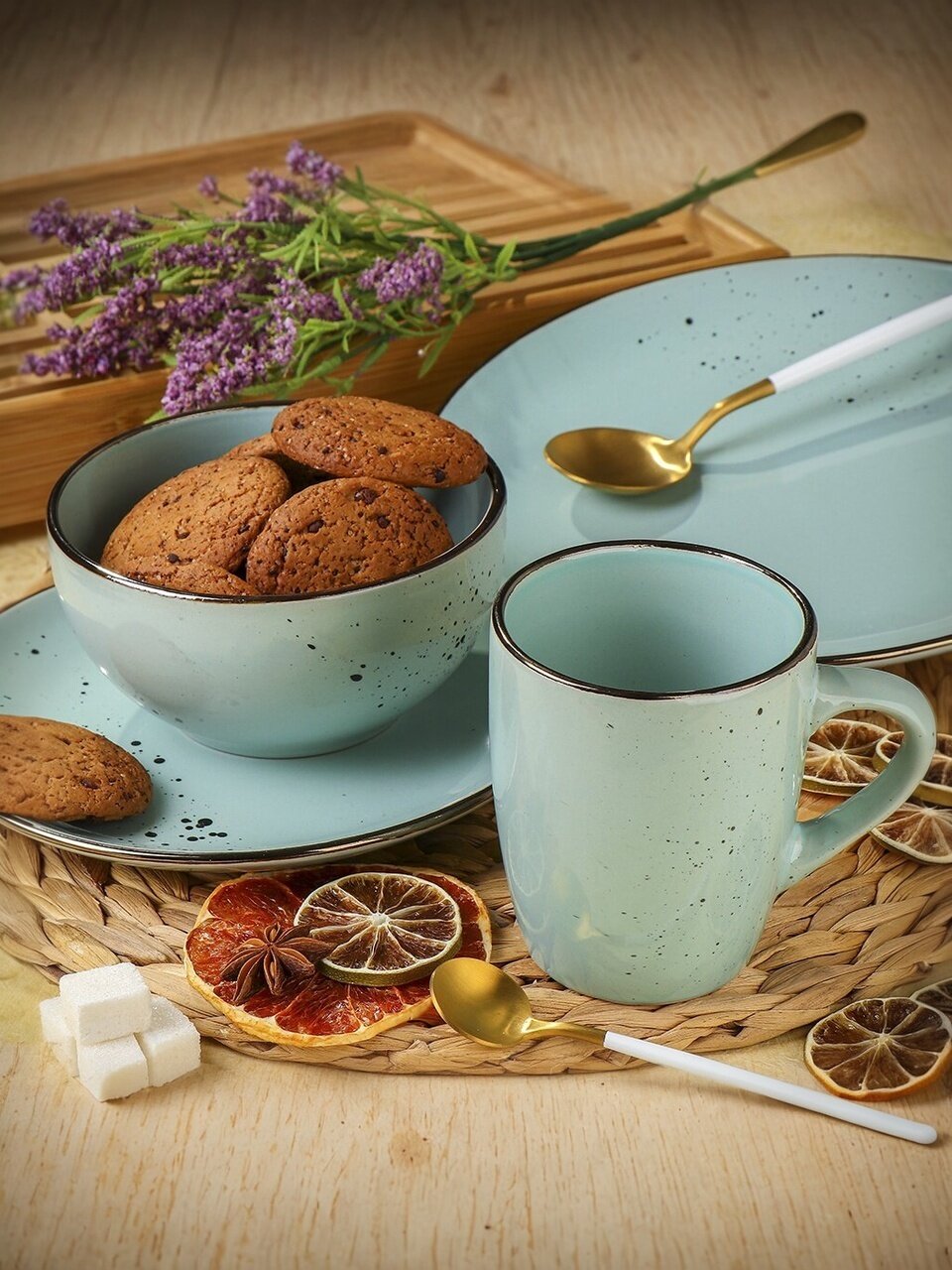 - Современный мятный дизайн с горошком — гармонично впишется в любой интерьер