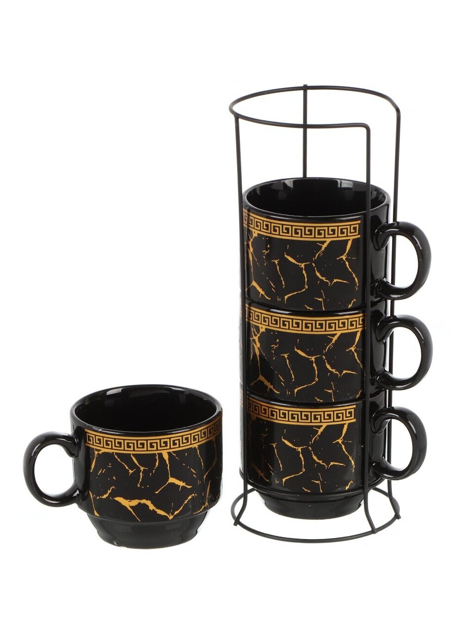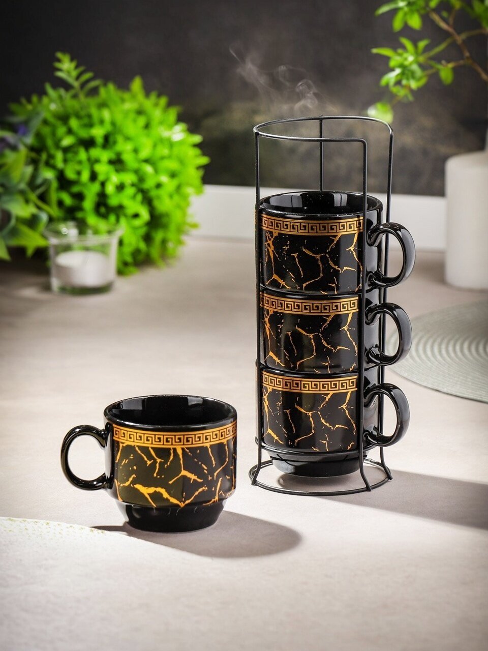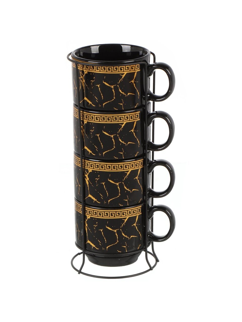 Керамические кружки с греческим узором, 4 шт по 160 мл, в стильной черной расцветке с металлической подставкой — идеальный набор для уютных чаепитий и подарков.