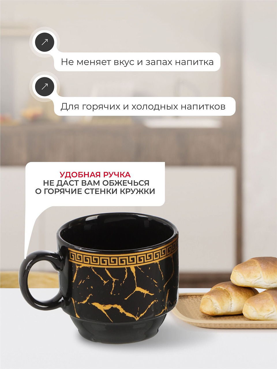 Ищете, какую керамическую кружку выбрать для повседневного чаепития или подарка? Набор из 4 кружек с греческим узором и металлической подставкой — это сочетание эстетики и практичности. Благодаря объему 160 мл (округленно 150 мл) кружки идеально подходят для кофе, чая и других напитков. Керамика без эмалевого покрытия обеспечивает приятную текстуру и сохраняет вкус напитка без посторонних запахов. Черный цвет и мраморный узор делают этот комплект стильным акцентом в современной кухне.