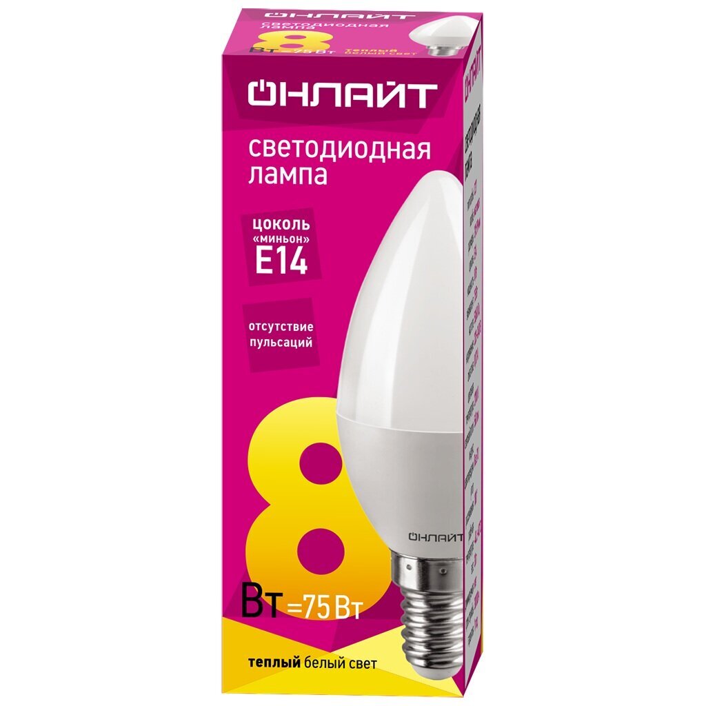 Лампа светодиодная E14, 8 Вт, 75 Вт, свеча, 2700 К, теплый белый свет, Онлайт, 71632