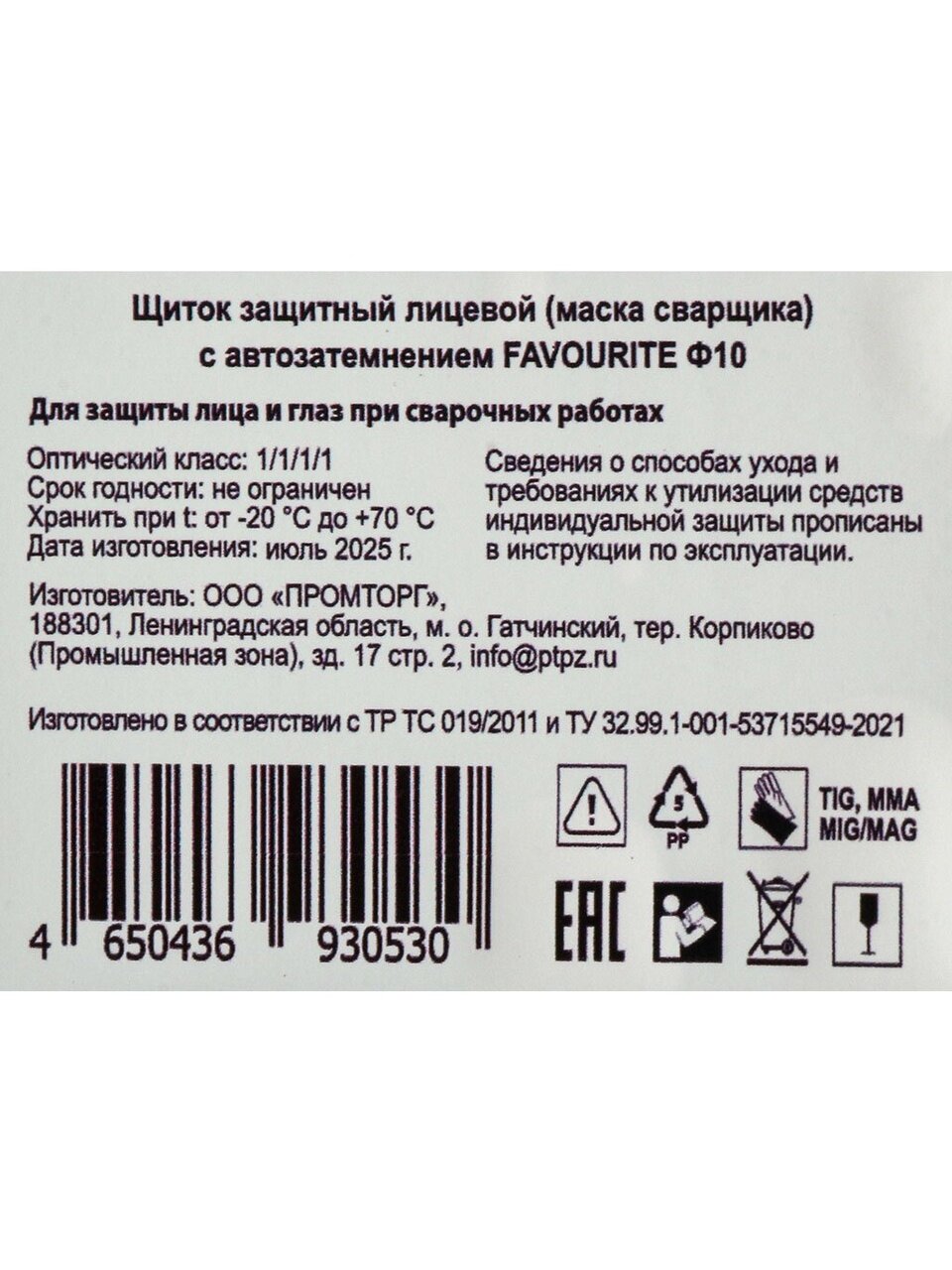 Ориентируйтесь на степень затемнения (3/4-8/9-13 DIN), наличие регулировки и материал корпуса. Favourite Хамелеон PRO Ф10 выполнена из ударопрочного полипропилена и подходит для большинства бытовых и профессиональных задач.