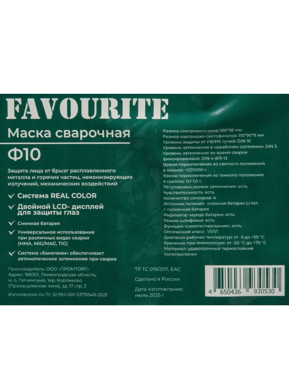 Маска сварочная Favourite Хамелеон PRO Ф10: автозатемнение 3/4-8/9-13 DIN, защита глаз и комфорт для профи и дома. Закажите выгодно!