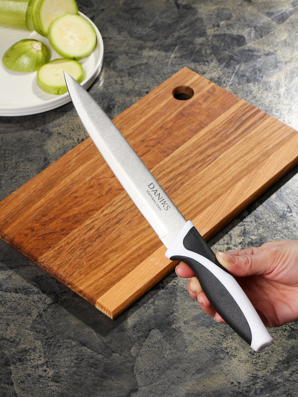 Как использовать набор? Просто: универсальный нож подойдёт для большинства продуктов, разделочный — для крупных кусков, а овощной — для мелкой нарезки. Можно ли мыть ножи в посудомойке? Да, материал лезвия и рукоятки рассчитан на автоматическую мойку, что экономит время.