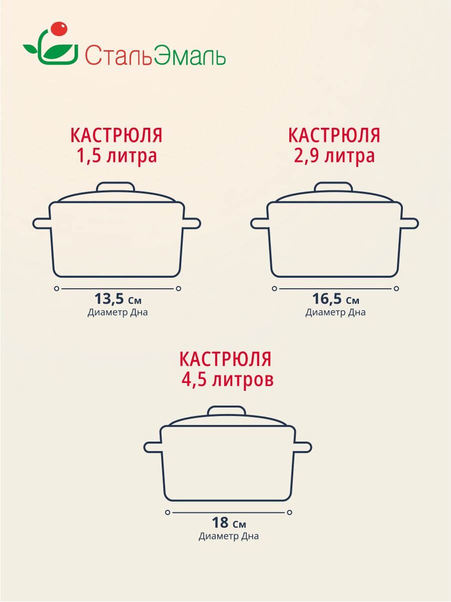 - Универсальный комплект: три кастрюли разного объёма (1,5/2,9/4,5 л) подходят для любых блюд и семей любого размера