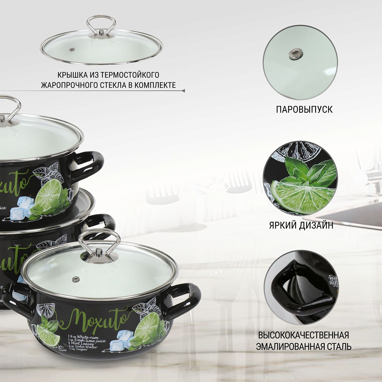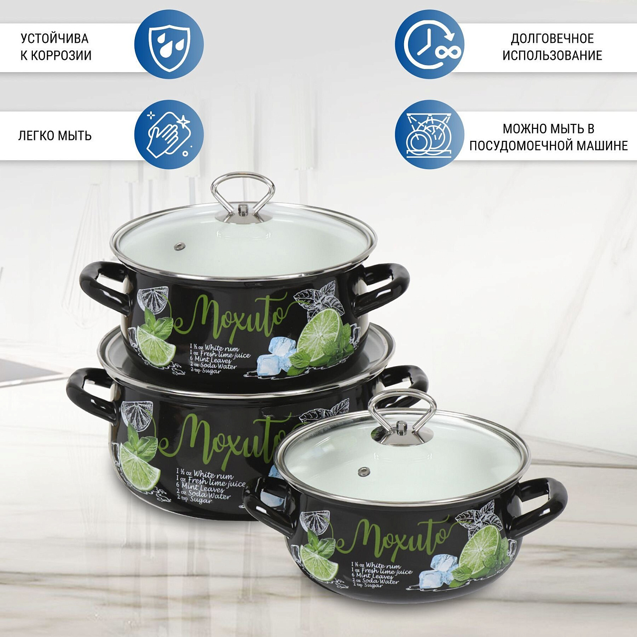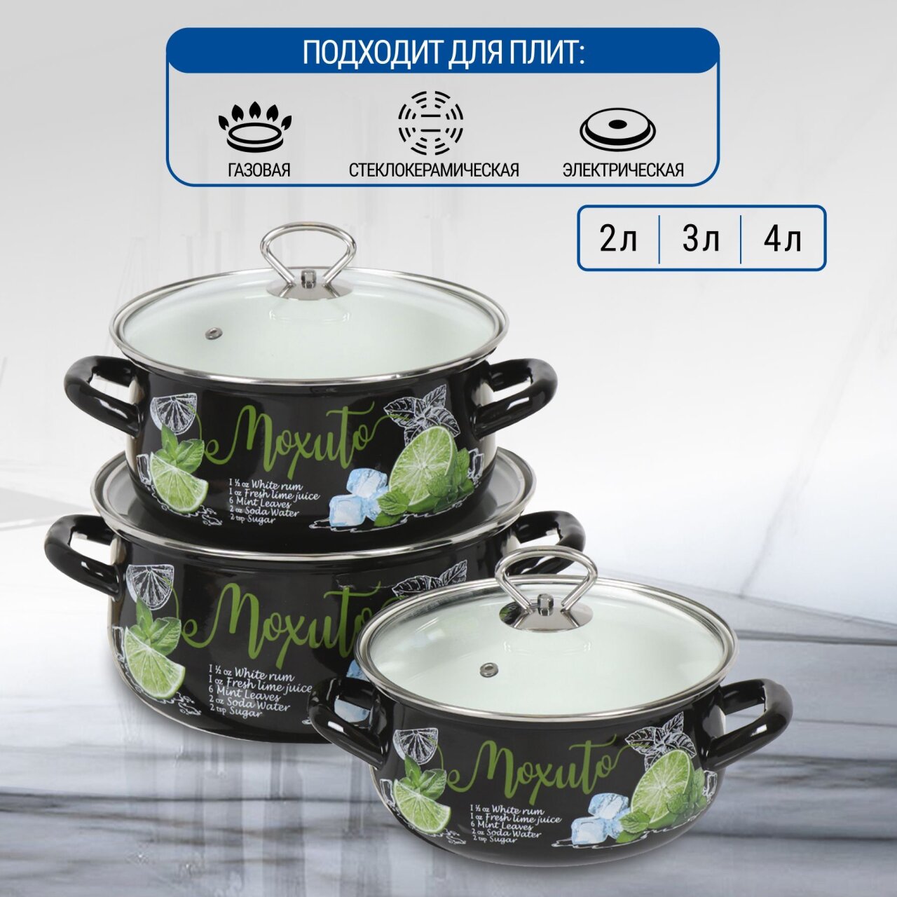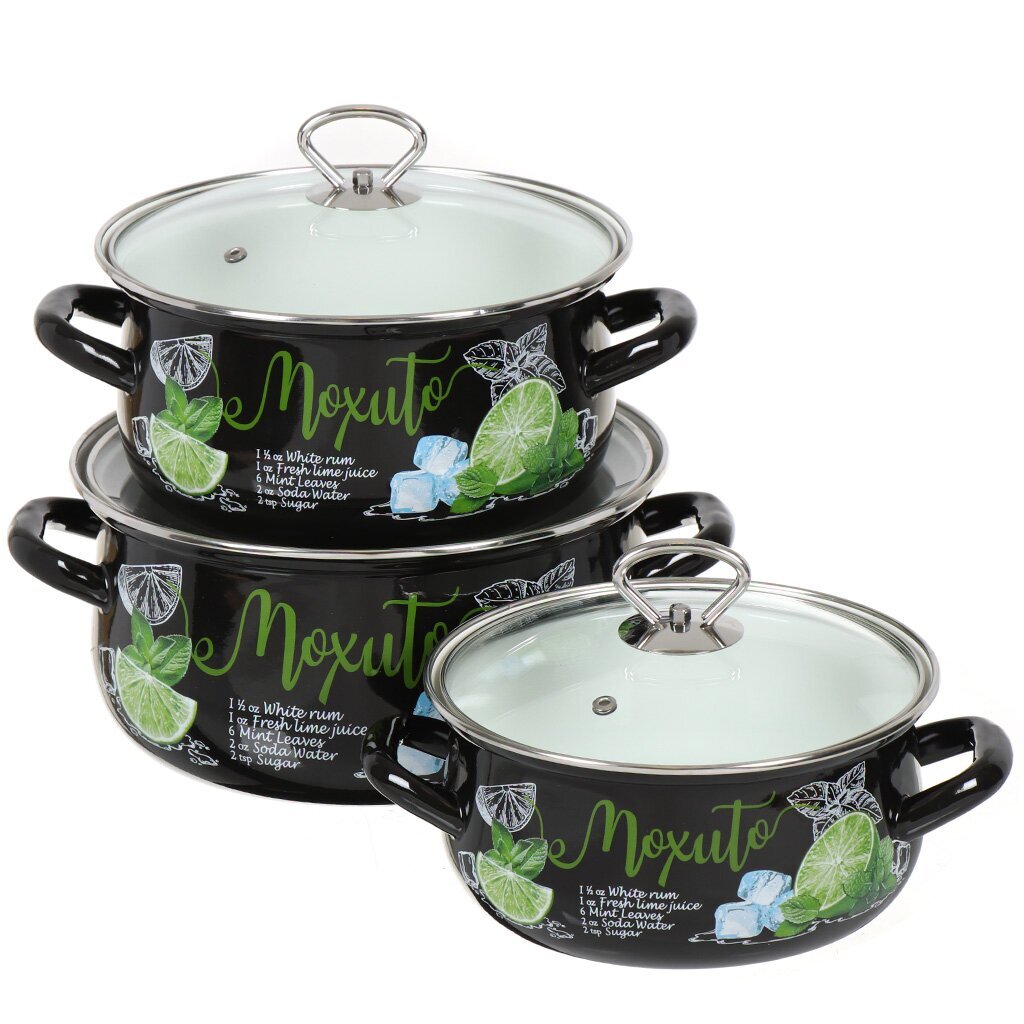 Вы можете приобрести «Набор посуды эмалированная сталь, 6 предметов, кастрюли 2,3,4 л, МП, Керченский металлургический завод, Мохито-1 Экстра Стиль, черный» и другие товары в нашем интернет-магазине в Санкт-Петербургe по низким ценам и с бесплатным самовывозом.