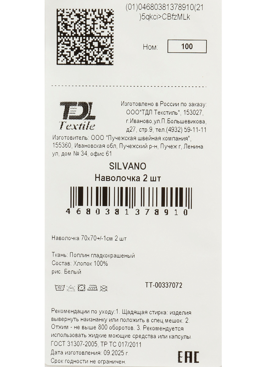 Наволочка 2 шт, Silvano, Белый, поплин, 100% хлопок, 70 х 70 см