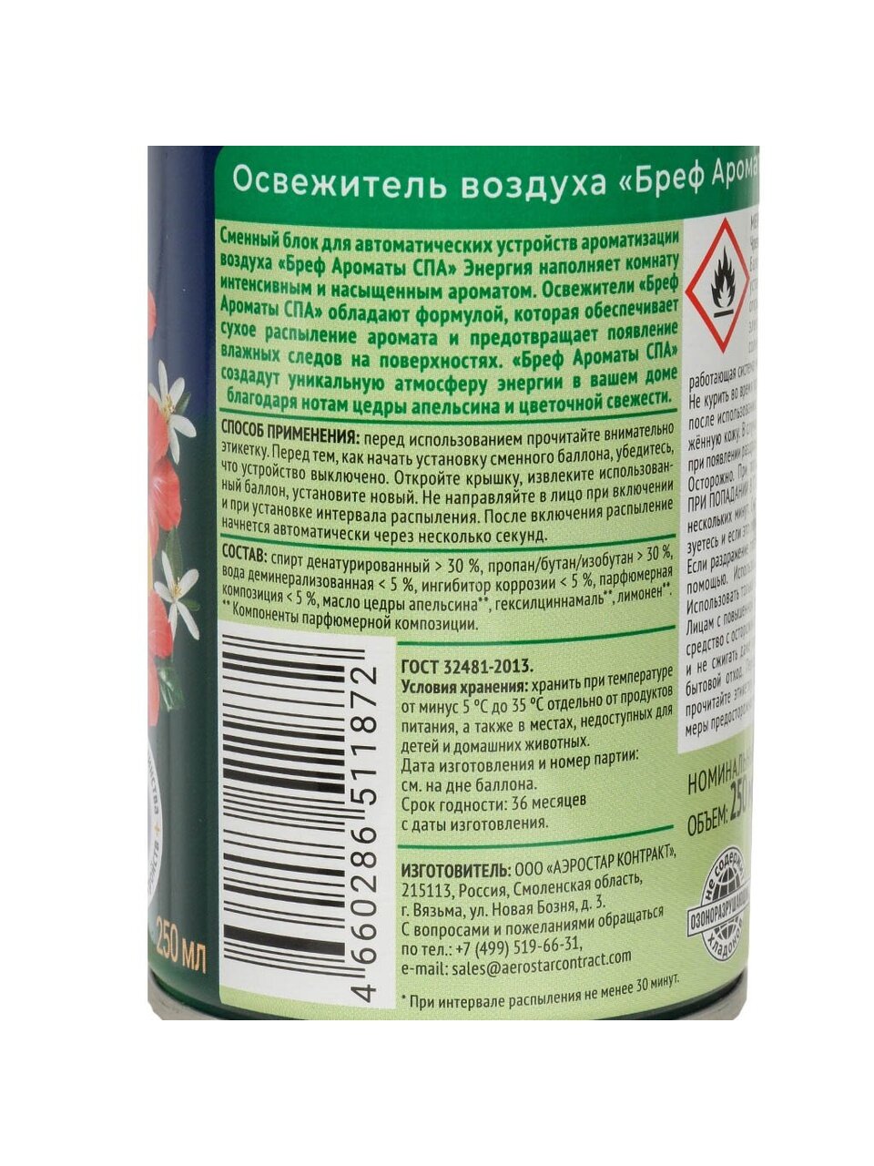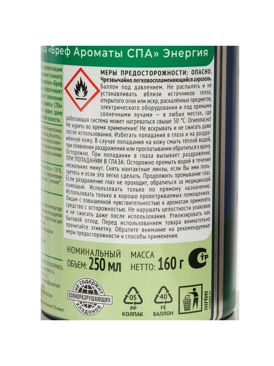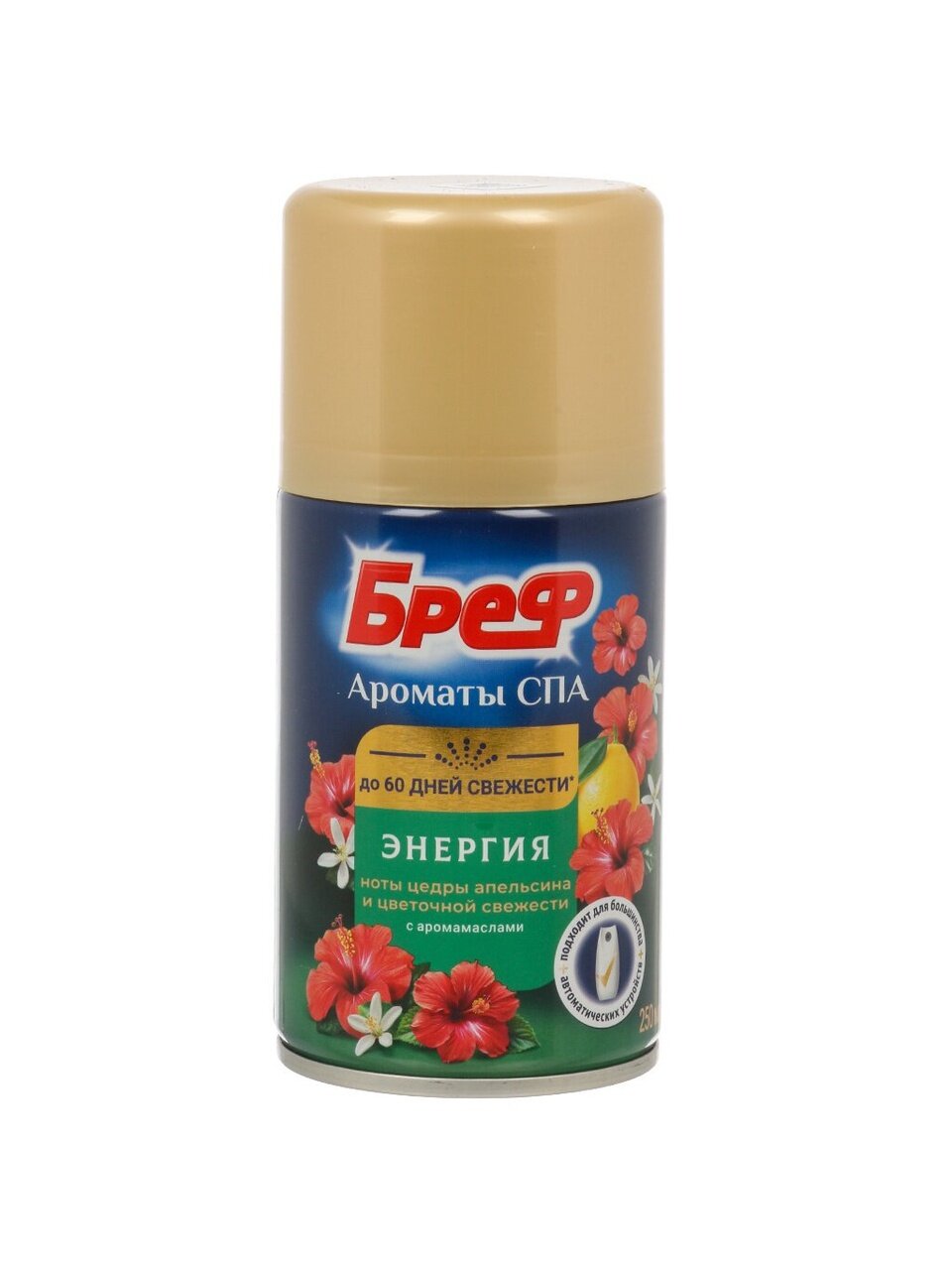 Освежитель Бреф Ароматы СПА Энергия 250 мл — это идеальное решение для поддержания свежести и уюта в ванной или туалетной комнате. Компактный сменный аэрозольный баллон обеспечивает эффективное устранение неприятных запахов, наполняя пространство яркими нотами цедры апельсина и цветочной свежести. Благодаря сухому распылению аромат распространяется быстро и равномерно, не оставляя следов на поверхностях и не создавая влажности в помещении.