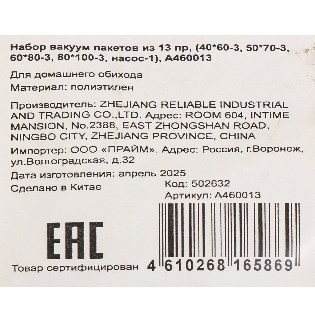 Набор вакуум пакетов из 13 пр, (40*60-3; 50*70-3; 60*80-3; 80*100-3;насос-1), A460013