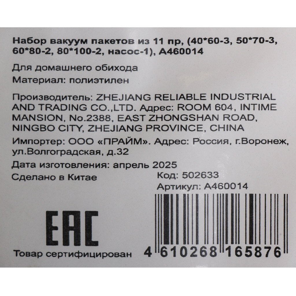 Набор вакуум пакетов из 11 пр, (40*60-3; 50*70-3; 60*80-2; 80*100-2;насос-1), A460014