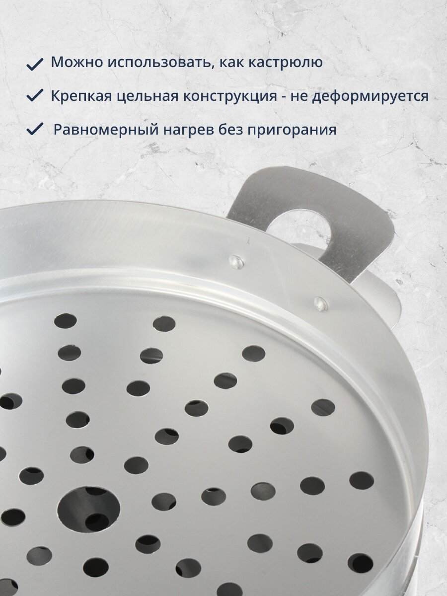 Мантоварка Калитва - это надежный инструмент для приготовления разнообразных блюд. Она идеально подходит для тушения, варки и приготовления на пару. Алюминиевый корпус обеспечивает равномерное распределение тепла, что позволяет добиться идеальных результатов при каждом использовании. Отсутствие эмалированного и антипригарного покрытия делает ее более экологически чистым выбором, сохраняя натуральные вкусы и ароматы продуктов.