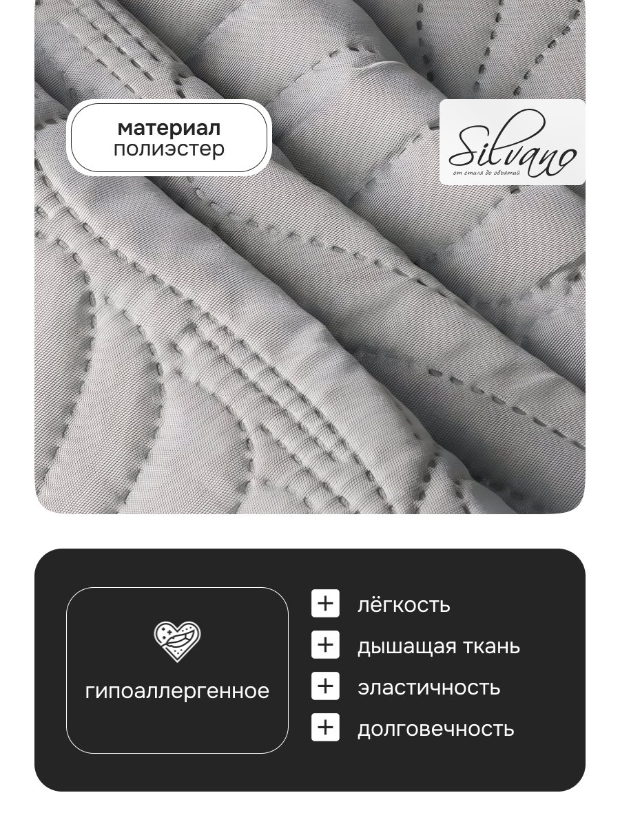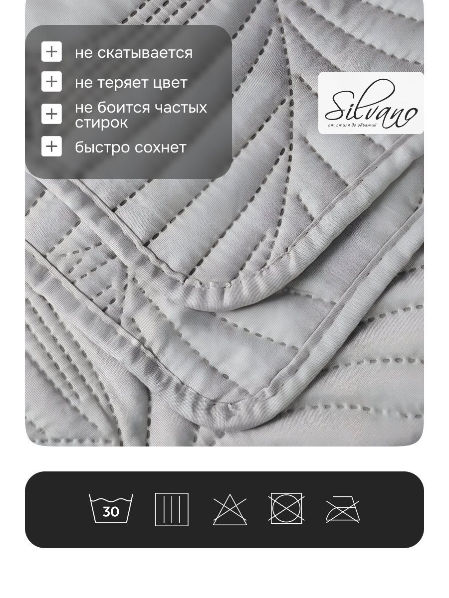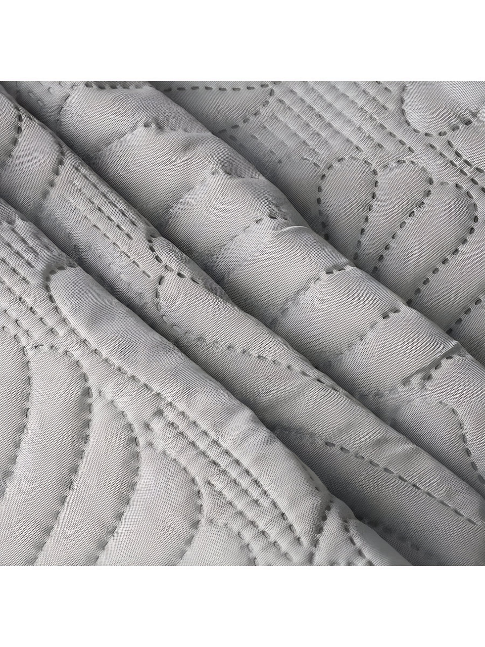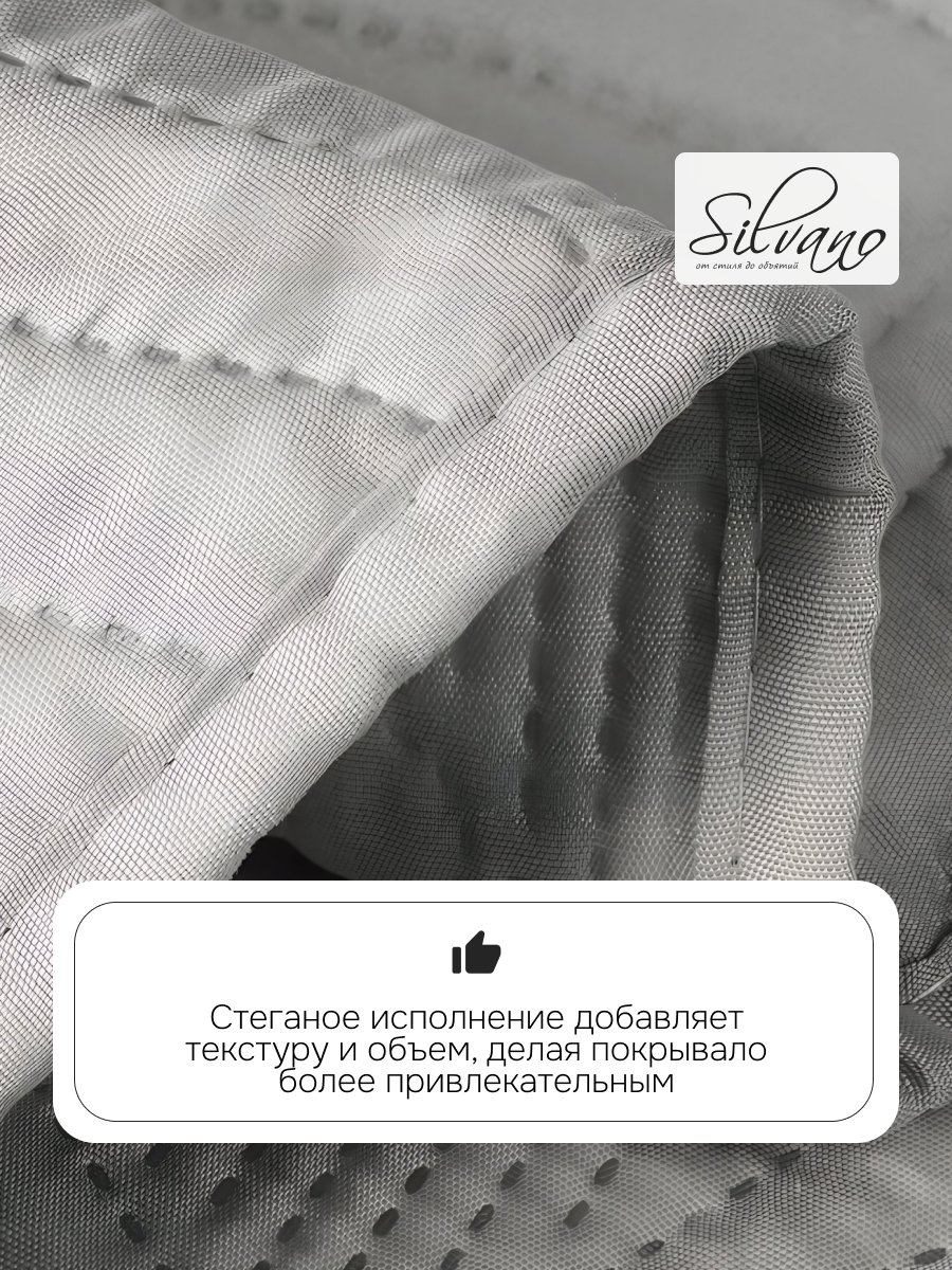 Покрывало выполнено из 100% полиэстера, что гарантирует долговечность и простоту в уходе. Стальной цвет, представленный на сайте как серый, легко впишется в любой интерьер, подчеркнув его минималистичный стиль. Стеганая структура не только добавляет изысканности, но и обеспечивает дополнительное тепло и комфорт.