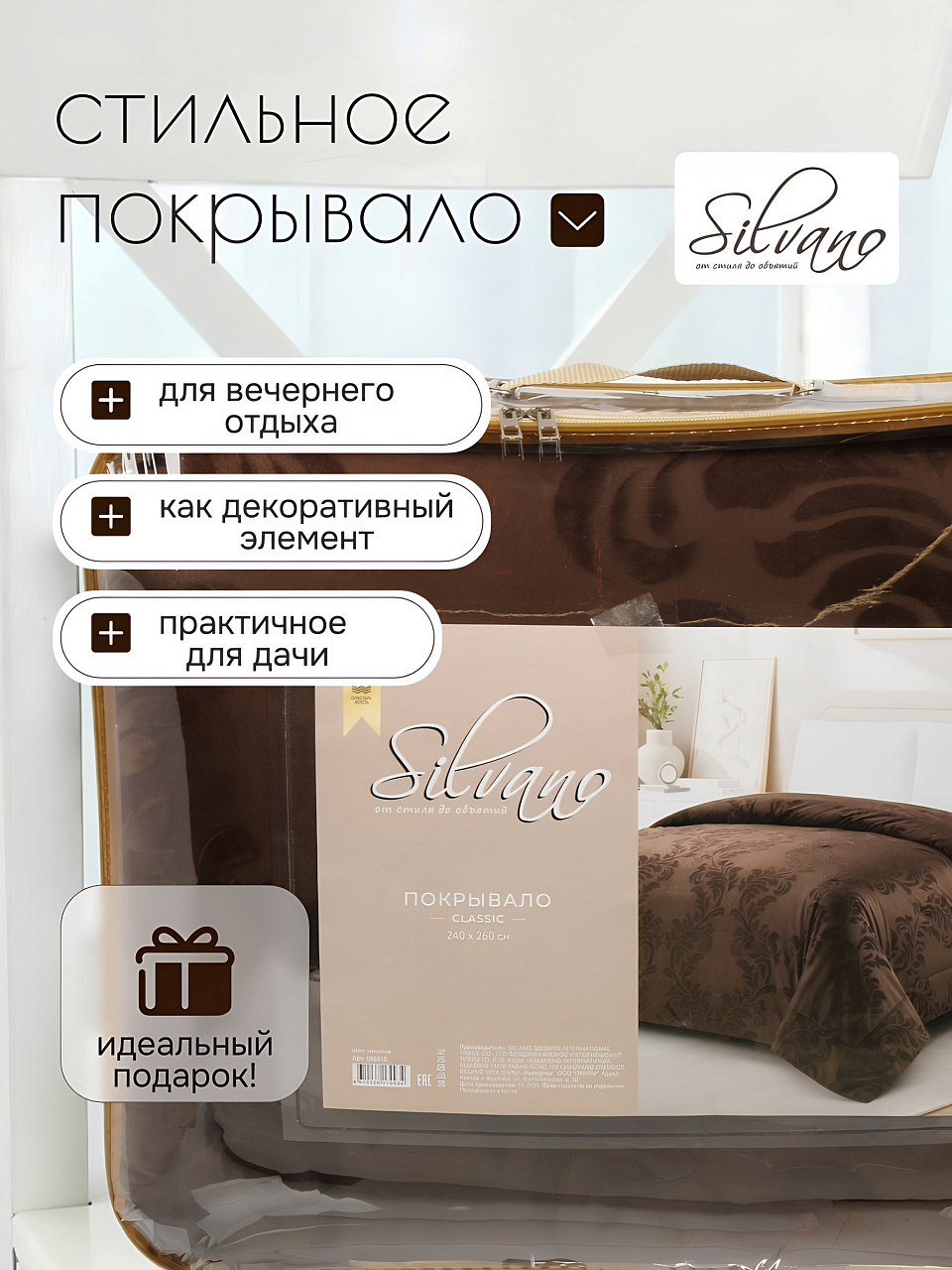 Покрывало евро Silvano Classic 240х260 см: стильный шоколадный оттенок, 100% полиэстер — максимум уюта и практичности для вашей спальни или гостиной.